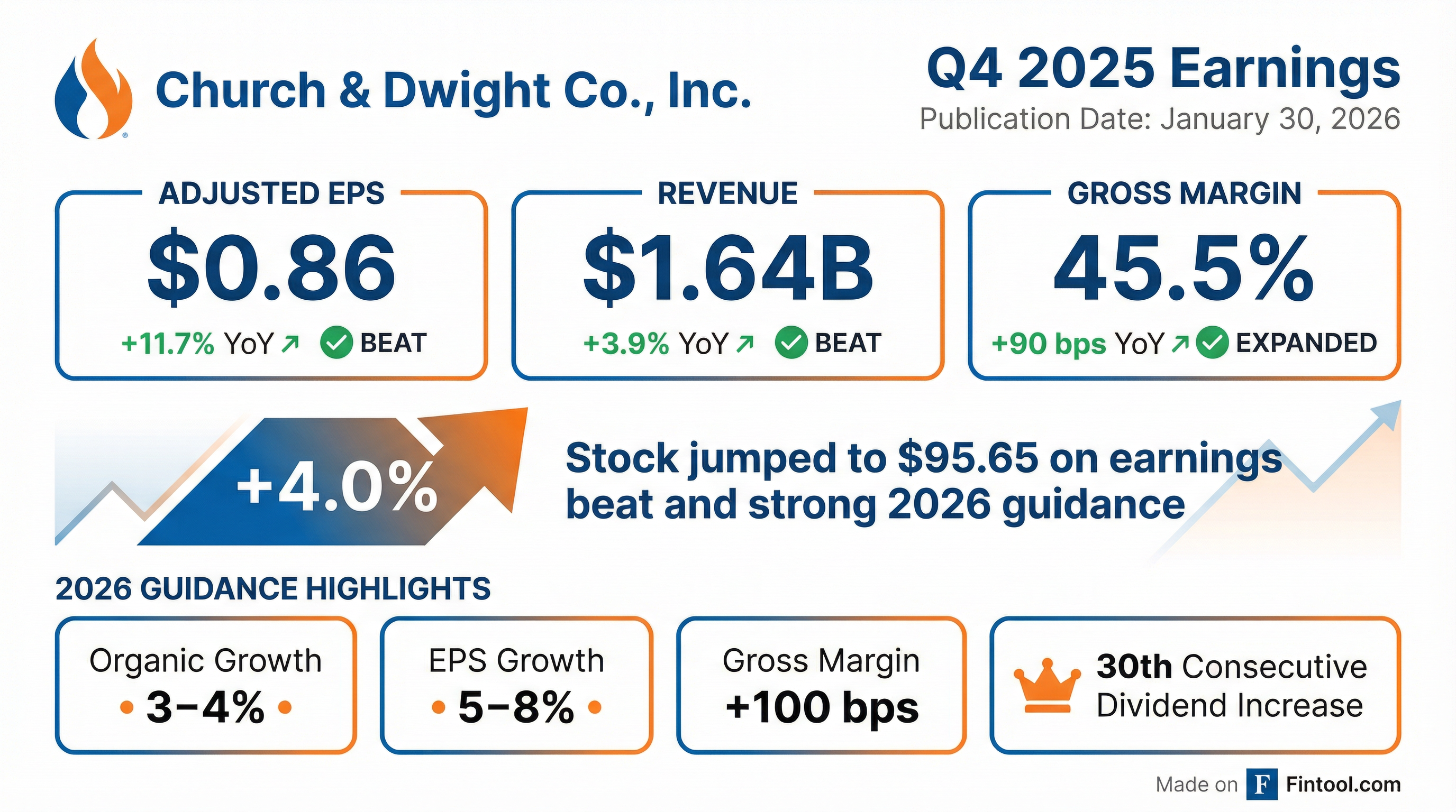 - Q4 sales of $1.6 billion were up 3.9%, with organic growth of 0.7% (1.8% ex-VMS), gross margin +90 bps, and EPS of $0.86, +12% YoY.