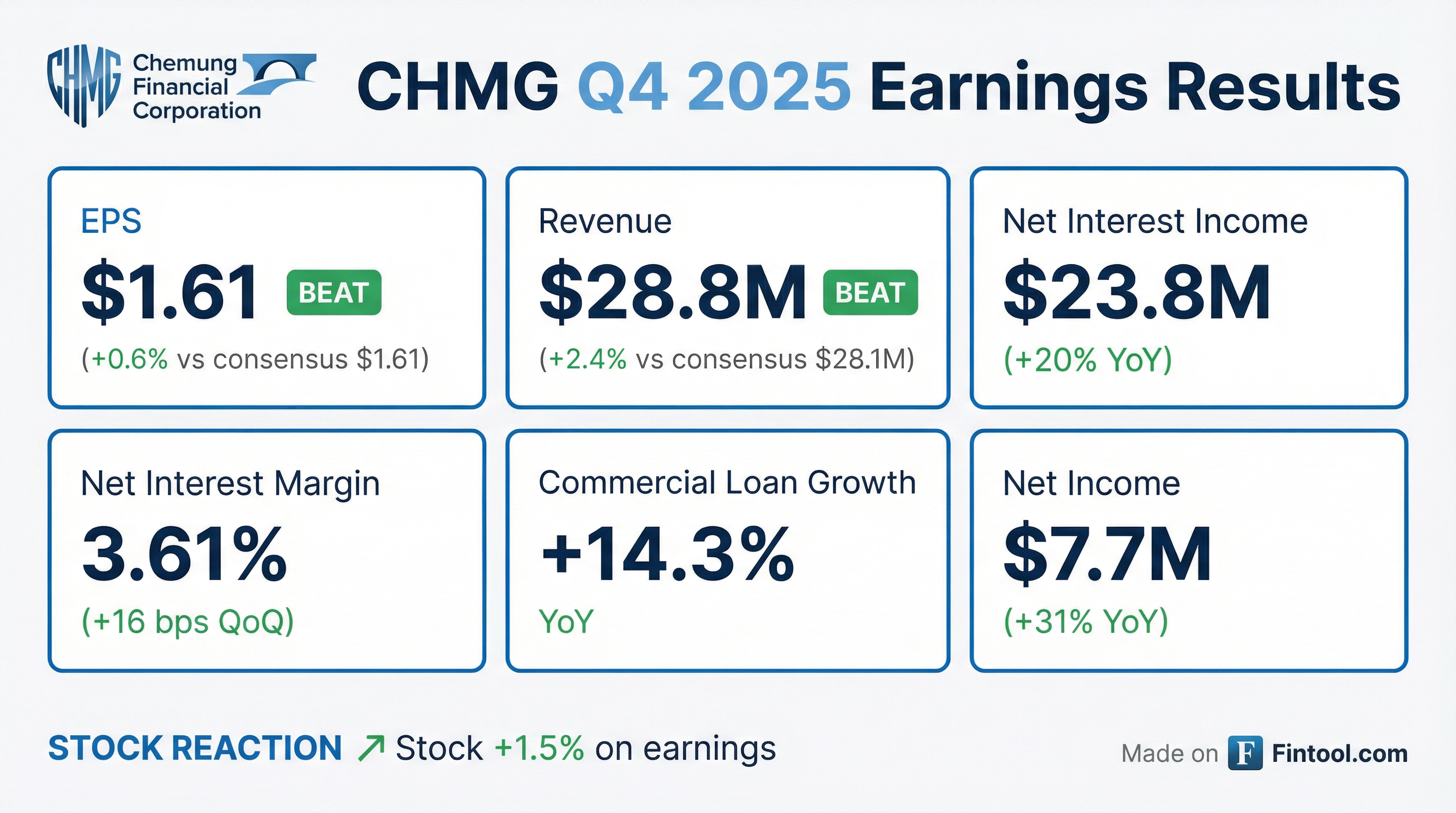 - Chemung Financial Corporation reported Q4 2025 EPS of $1.61 and full-year 2025 non-GAAP net income of $27.9 million, with a Net Interest Margin of 3.61% for Q4 2025.