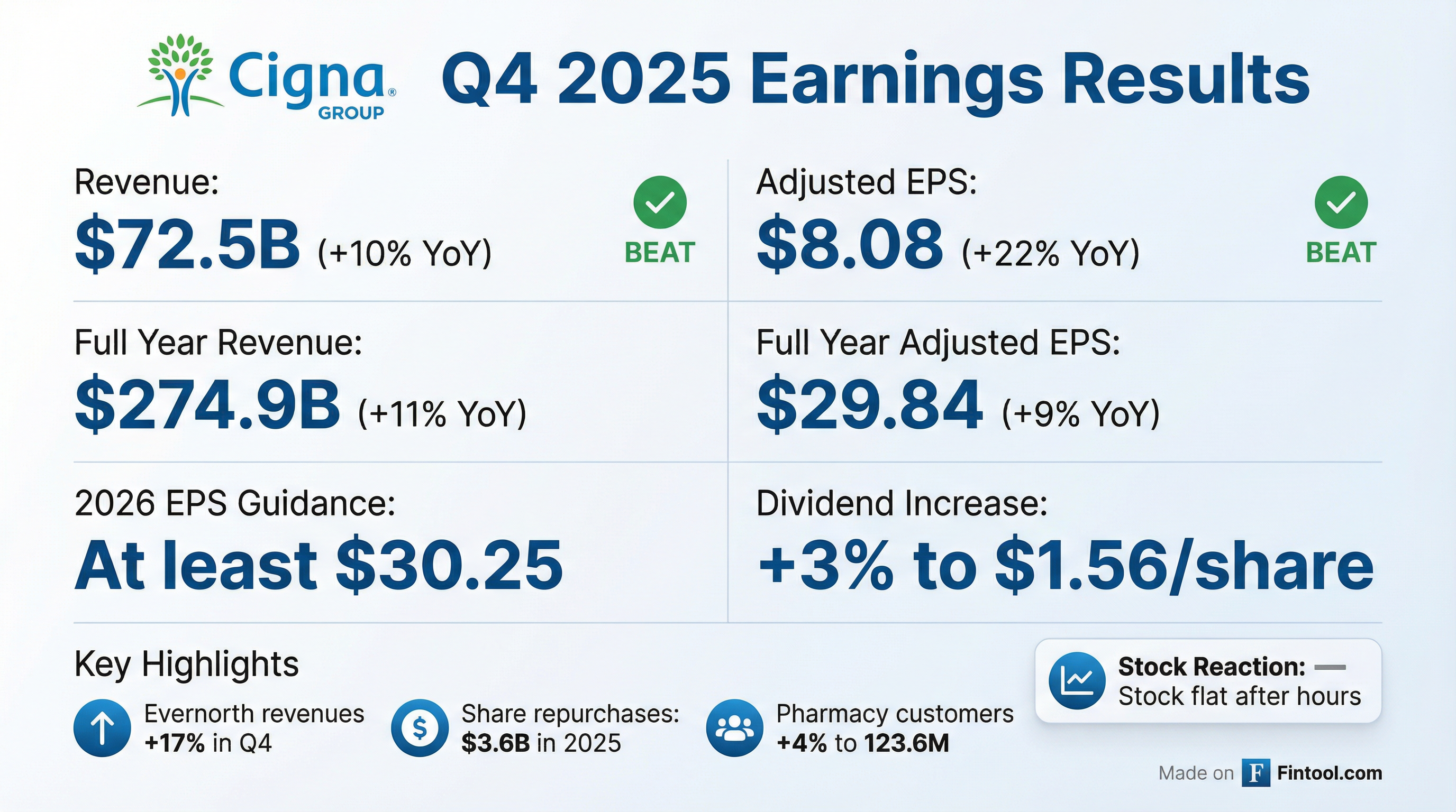 - Cigna delivered adjusted EPS of $8.08 vs. $7.88 expected and revenue of $72.4 billion (+10.4% YoY), topping FactSet estimates.