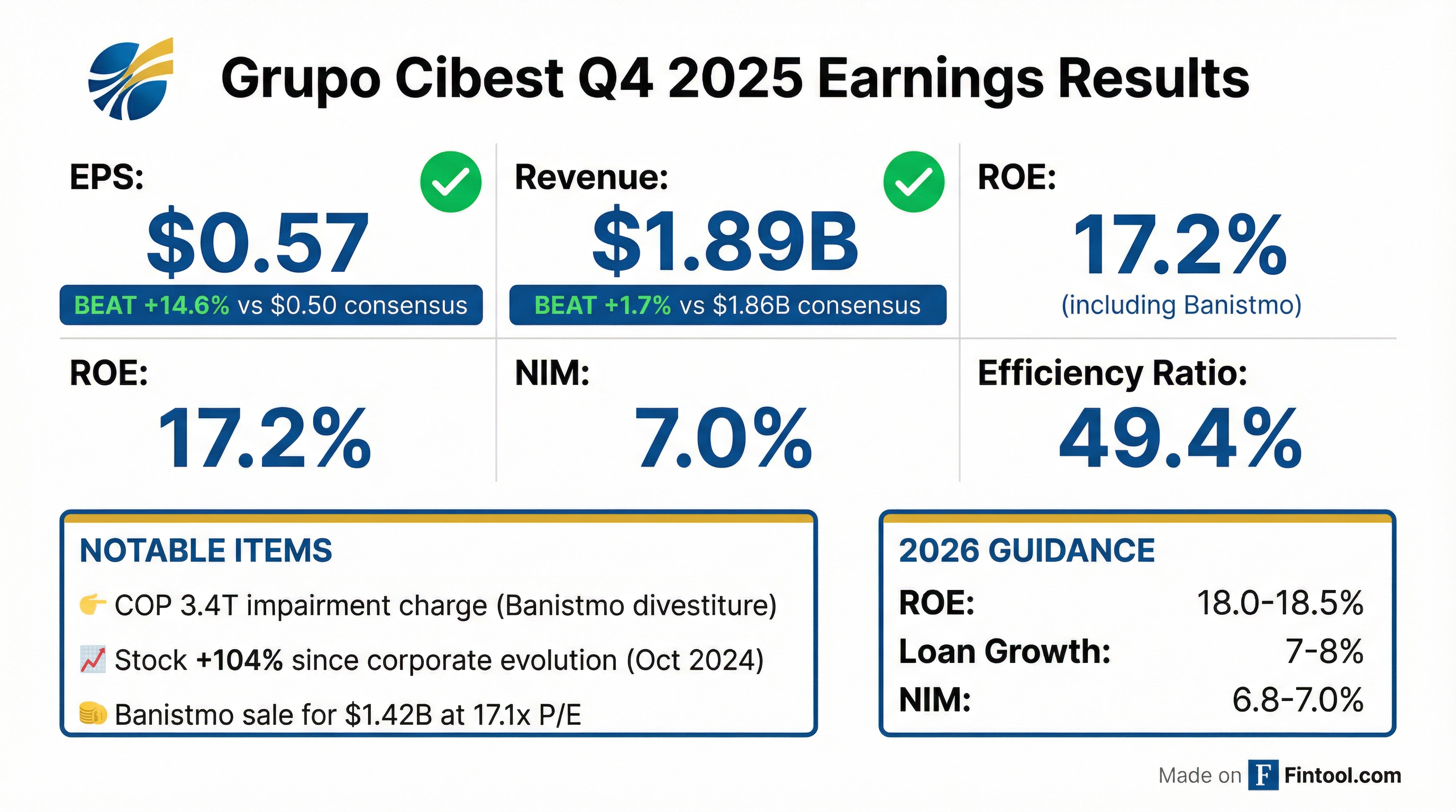 - Grupo Cibest's Q4 2025 results were impacted by a one-time, non-cash impairment charge of COP $3.4 Trillion related to the Banistmo divestment. Despite this, the company outperformed its 17% ROE guidance for 2025 when excluding one-off items.