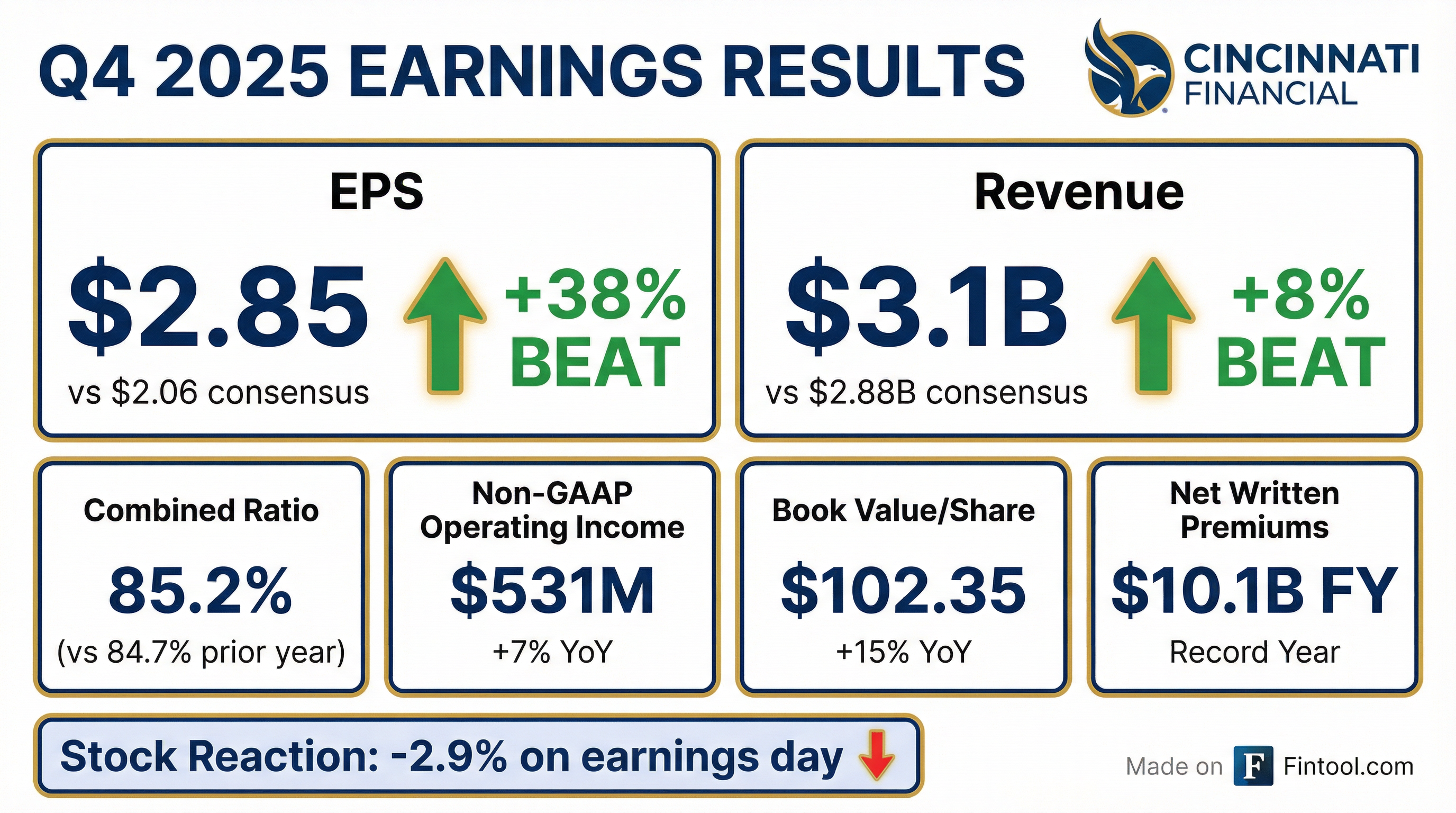 - Cincinnati Financial delivered Q4 net income of $676 million (+67%) and full-year net income of $2.4 billion (+4%); Q4 non-GAAP operating income rose 7% to $531 million, and the combined ratio was 85.2% in Q4 and 94.9% for FY 2025, with net written premiums up 5% in the quarter.