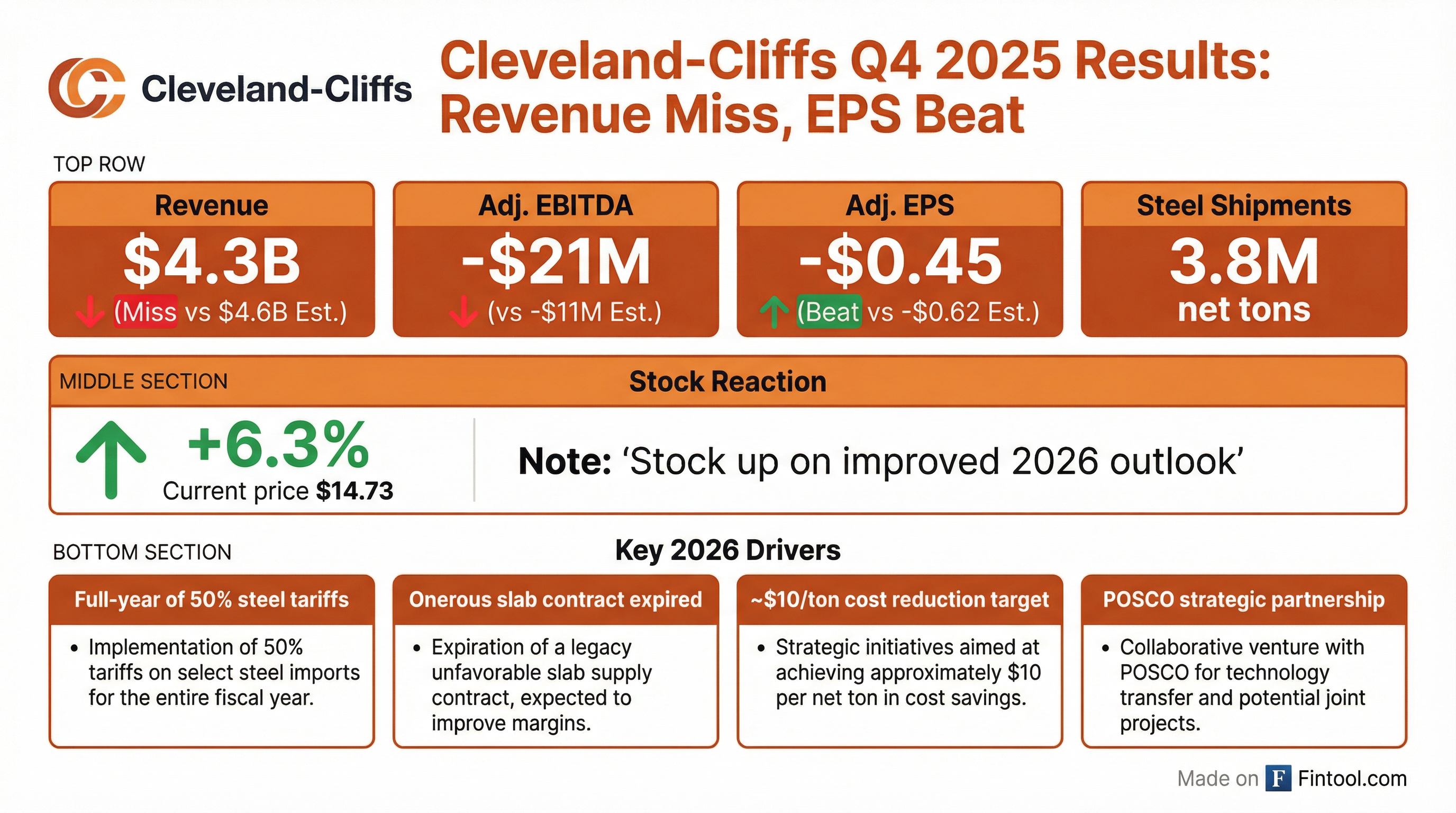 - Cleveland-Cliffs Inc. reported Q4 2025 consolidated revenues of $4.3 billion and a GAAP net loss of $235 million, or $0.44 per diluted share. For the full-year 2025, consolidated revenues were $18.6 billion, with a GAAP net loss of $1.4 billion, or $2.91 per diluted share.