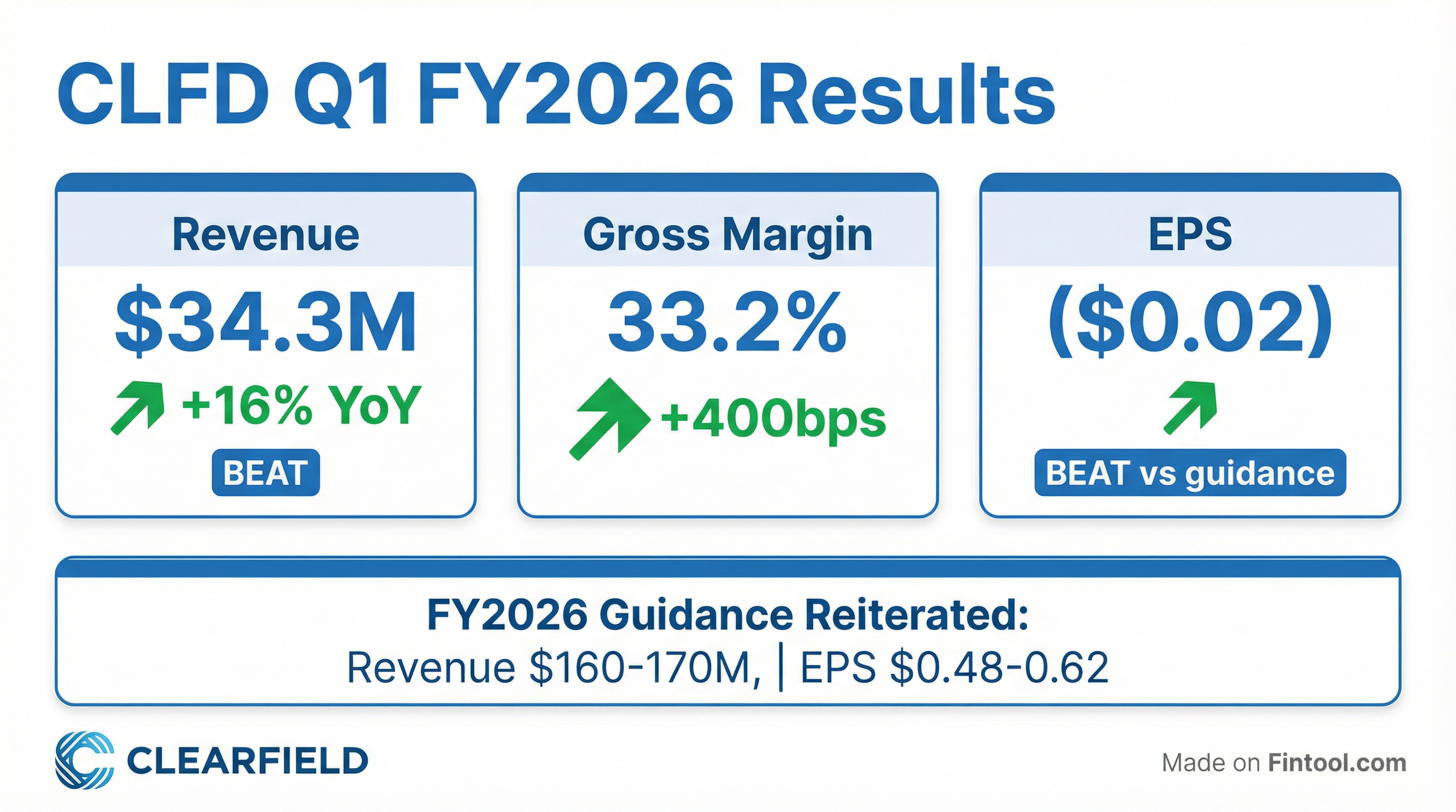 - Clearfield reported Q1 2026 net sales from continuing operations of $34.3 million, surpassing its guidance range of $30 million-$33 million, and a net loss per share from continuing operations of $0.02.