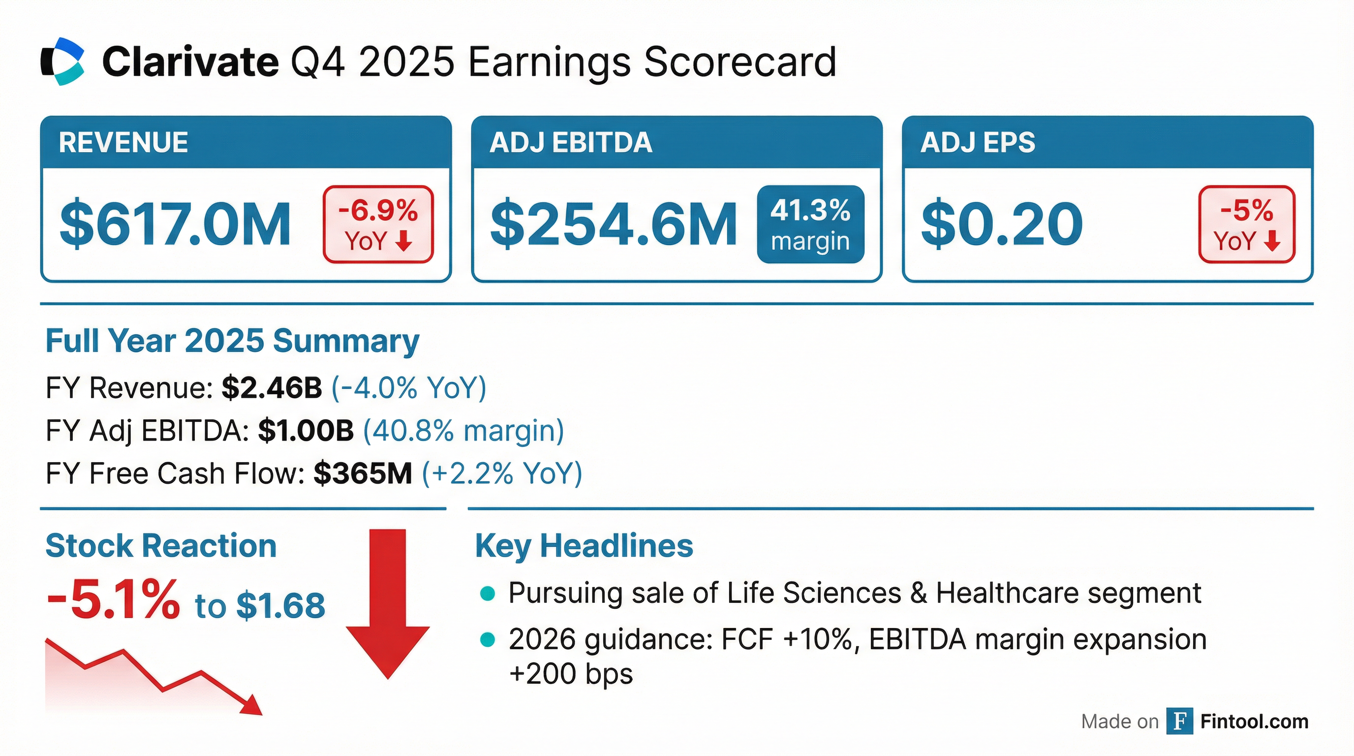 - Clarivate delivered on its full-year 2025 financial guide for the first time since 2019, reporting $2.455 billion in revenue, more than $1 billion in adjusted EBITDA, and $365 million in free cash flow.