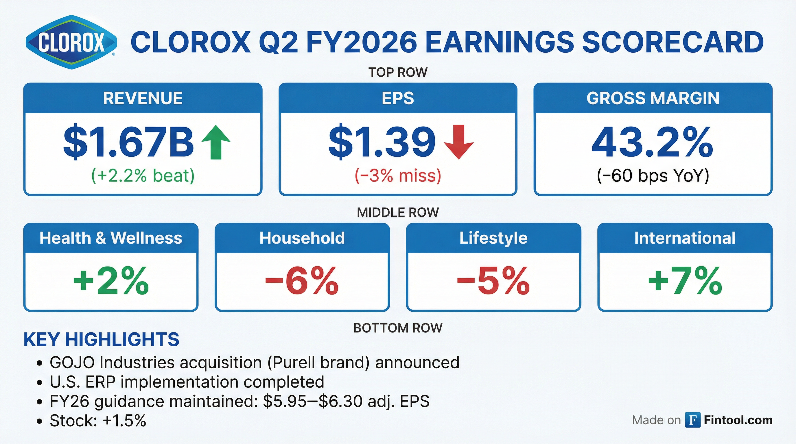 - Clorox posted $1.67 billion in Q2 revenue, flat y/y, with net income of $157 million (GAAP EPS $1.29, down from $1.54) and non-GAAP EPS of $1.39, missing estimates by ~$0.04.