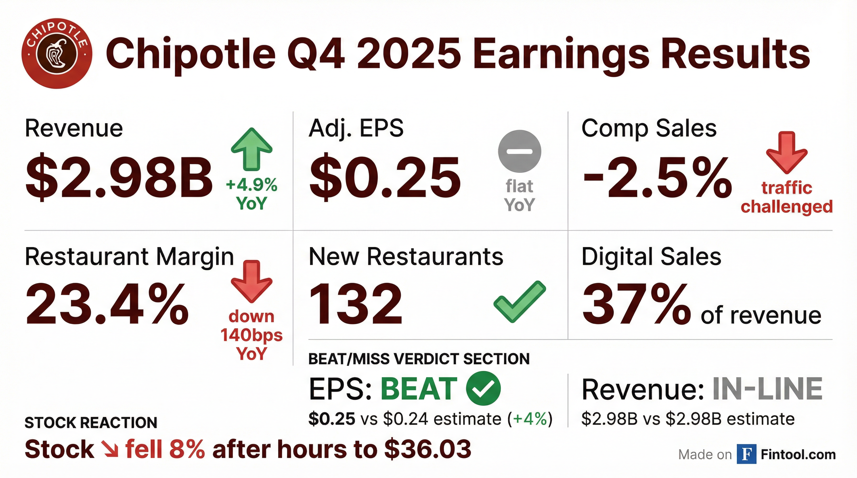 - Chipotle reports Q4 2025 revenue of $3.0 B (+4.9% YoY), comparable restaurant sales down 2.5%, and adjusted EPS of $0.25.