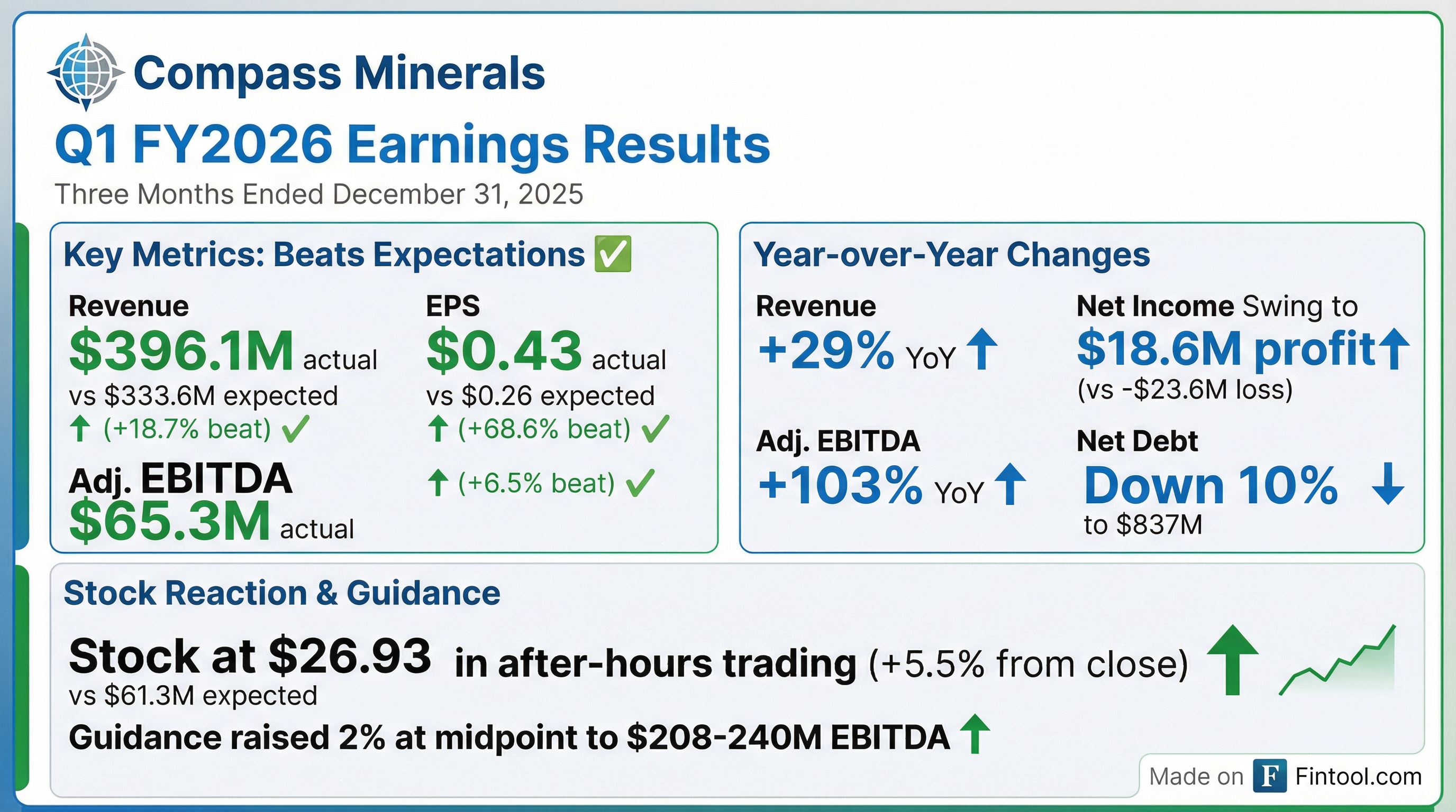 - Compass Minerals reported fiscal 2026 first-quarter net income of $18.6 million, a significant improvement from a net loss in the prior year, and total company adjusted EBITDA of $65.3 million, up 103% year over year.