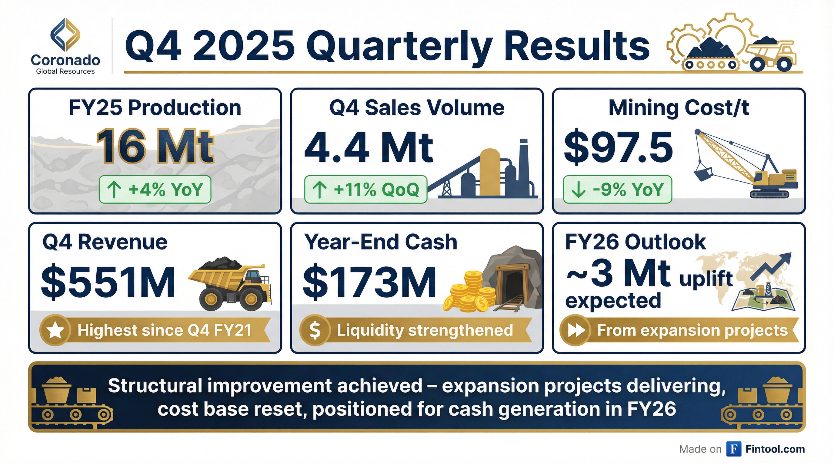 - Coronado forecasts US$67 million in EBITDA for 2026 and US$415 million for 2027, anticipating a rebound in met coal pricing to >$200/t by 2027.