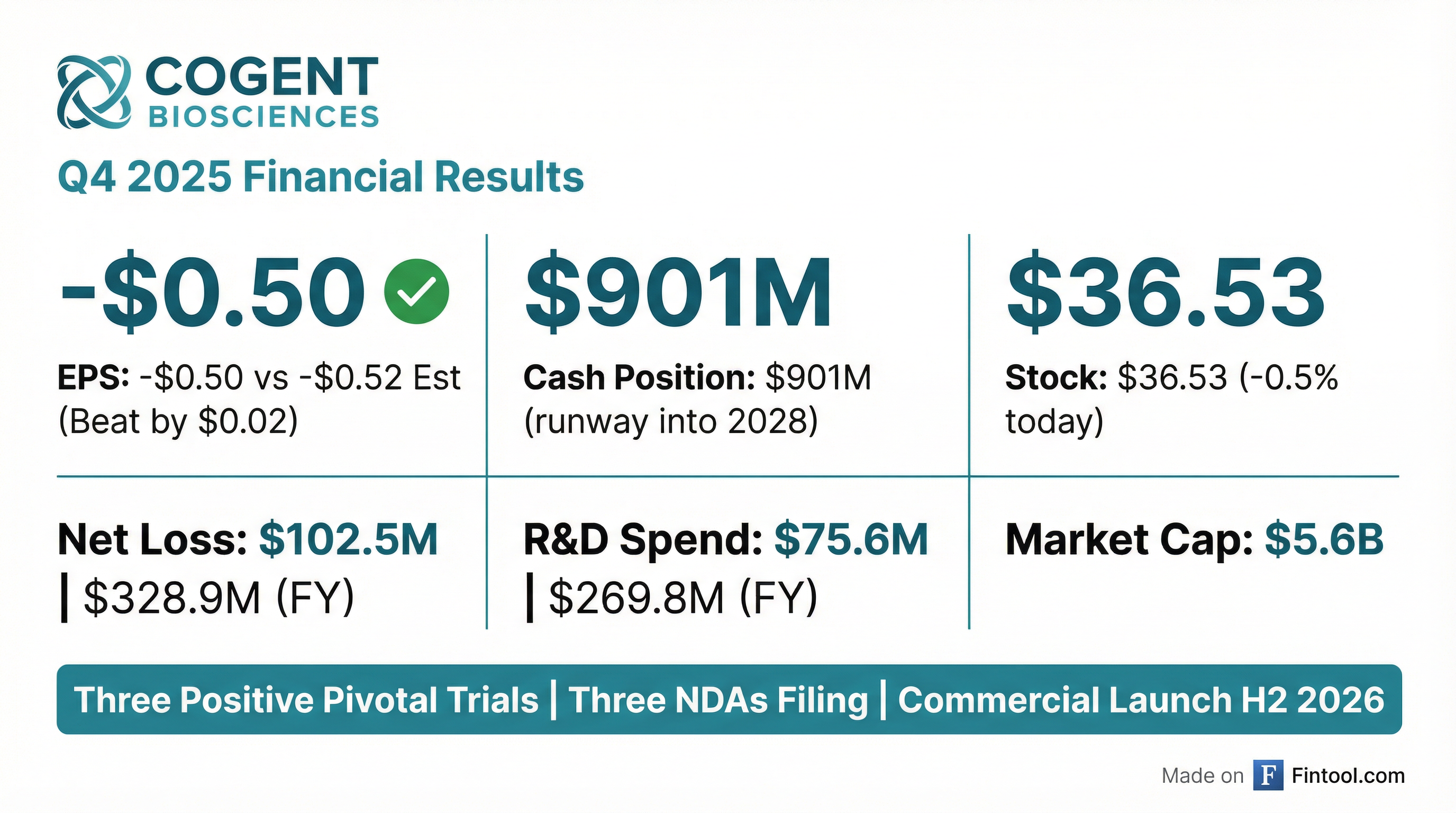 - For the fourth quarter and full year ended December 31, 2025, Cogent Biosciences reported a net loss of $102.5 million and $328.9 million, respectively.