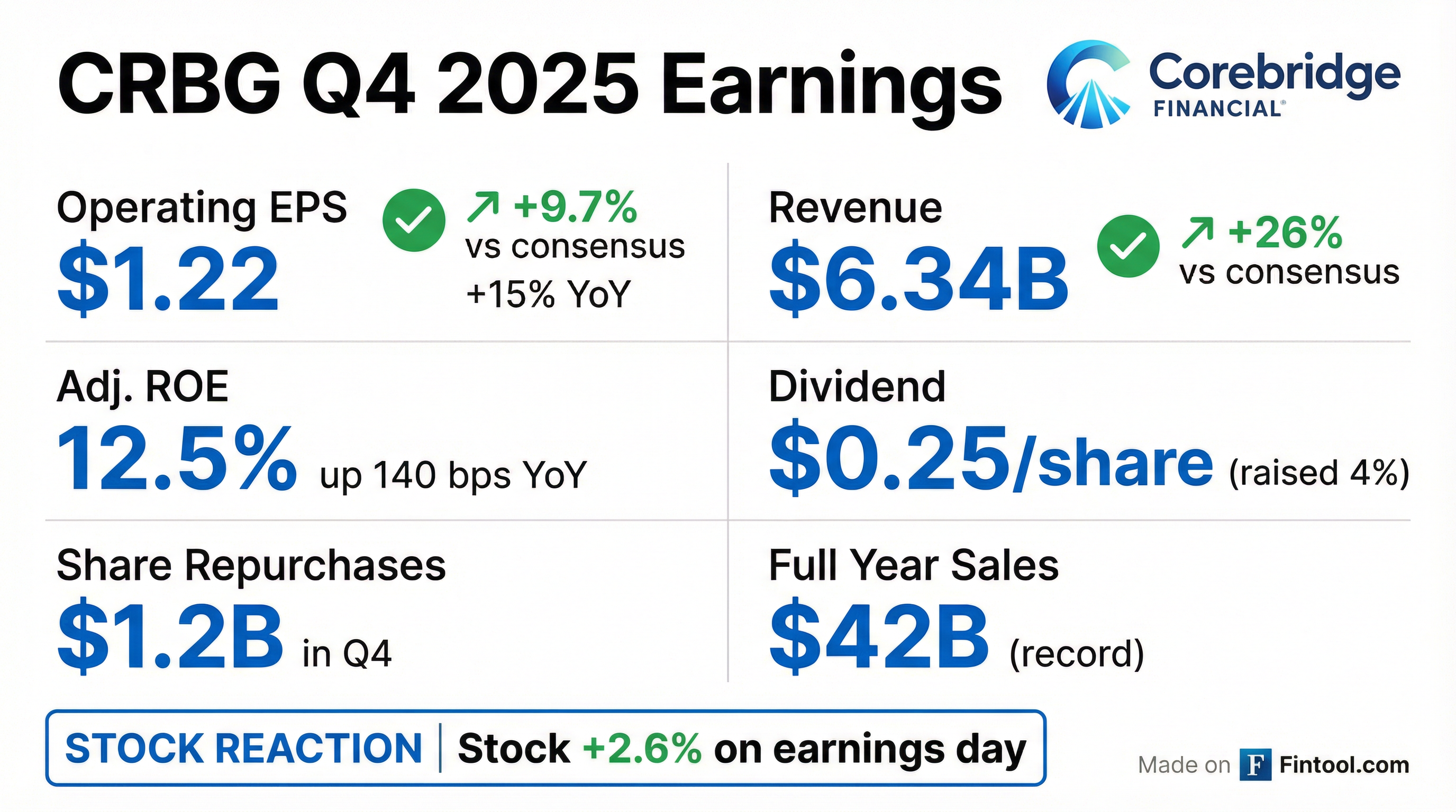 - Corebridge Financial reported a strong Q4 2025 operating EPS of $1.22, a 15% year-over-year increase, and full year 2025 sales grew 4% to a record $42 billion.