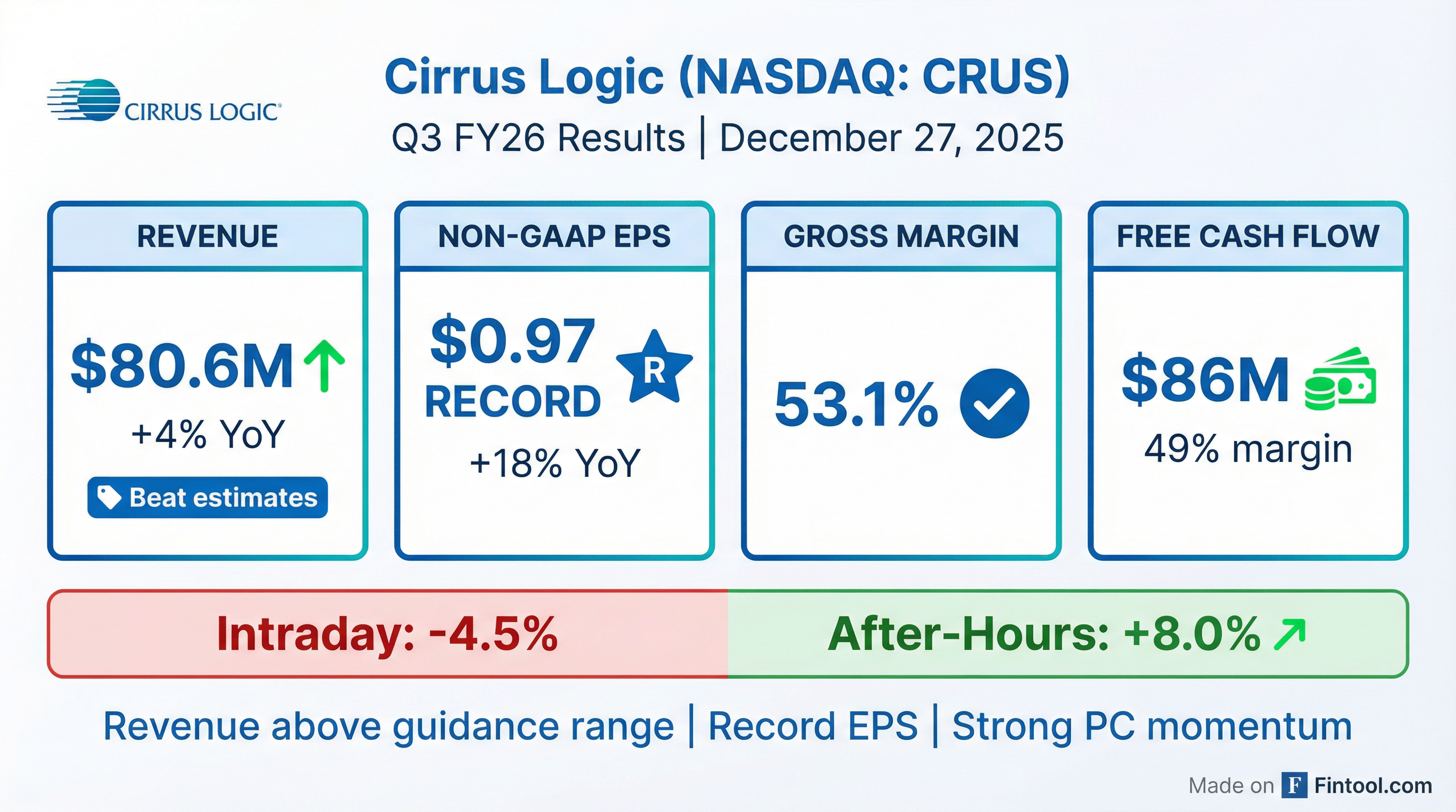 - Cirrus Logic reported Q3 FY26 revenue of $580.6 million, exceeding guidance, with GAAP earnings per share of $2.66 and non-GAAP earnings per share of $2.97, and a gross margin of 53.1 percent.