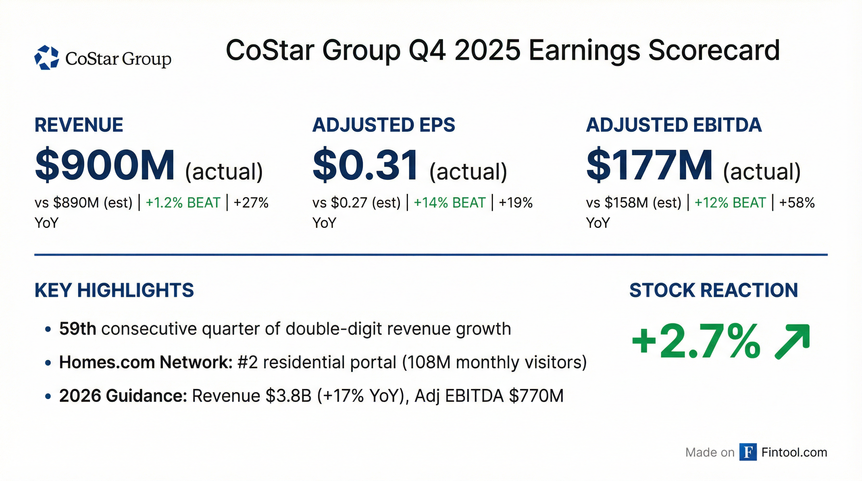 - CoStar Group posted Q4 revenue of $900 million (up 27% YoY) and full‐year 2025 revenue of $3.2 billion (up 19% YoY), alongside full‐year adjusted EBITDA of $442 million (14% margin, +83% YoY).