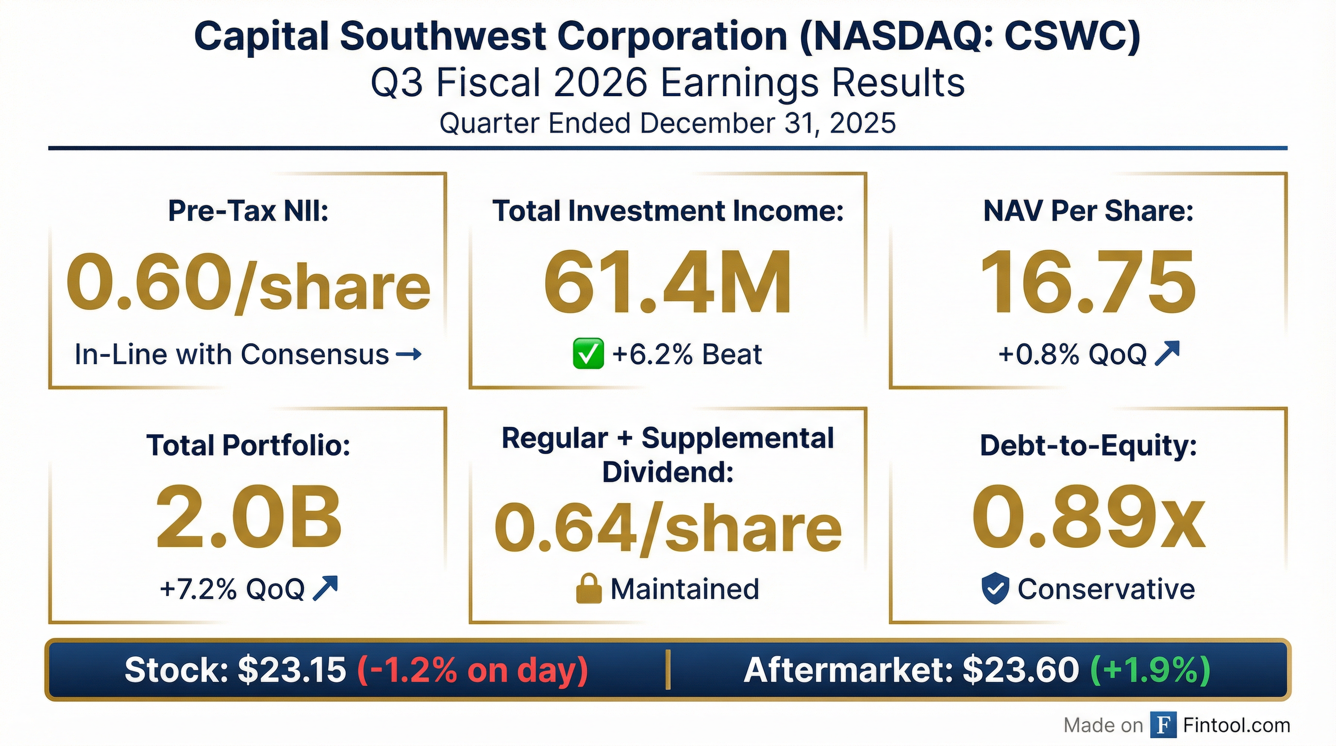 - CSWC reported Pre-Tax Net Investment Income of $34.6 million, or $0.60 per share, for Q3 2026 (quarter ended December 31, 2025).