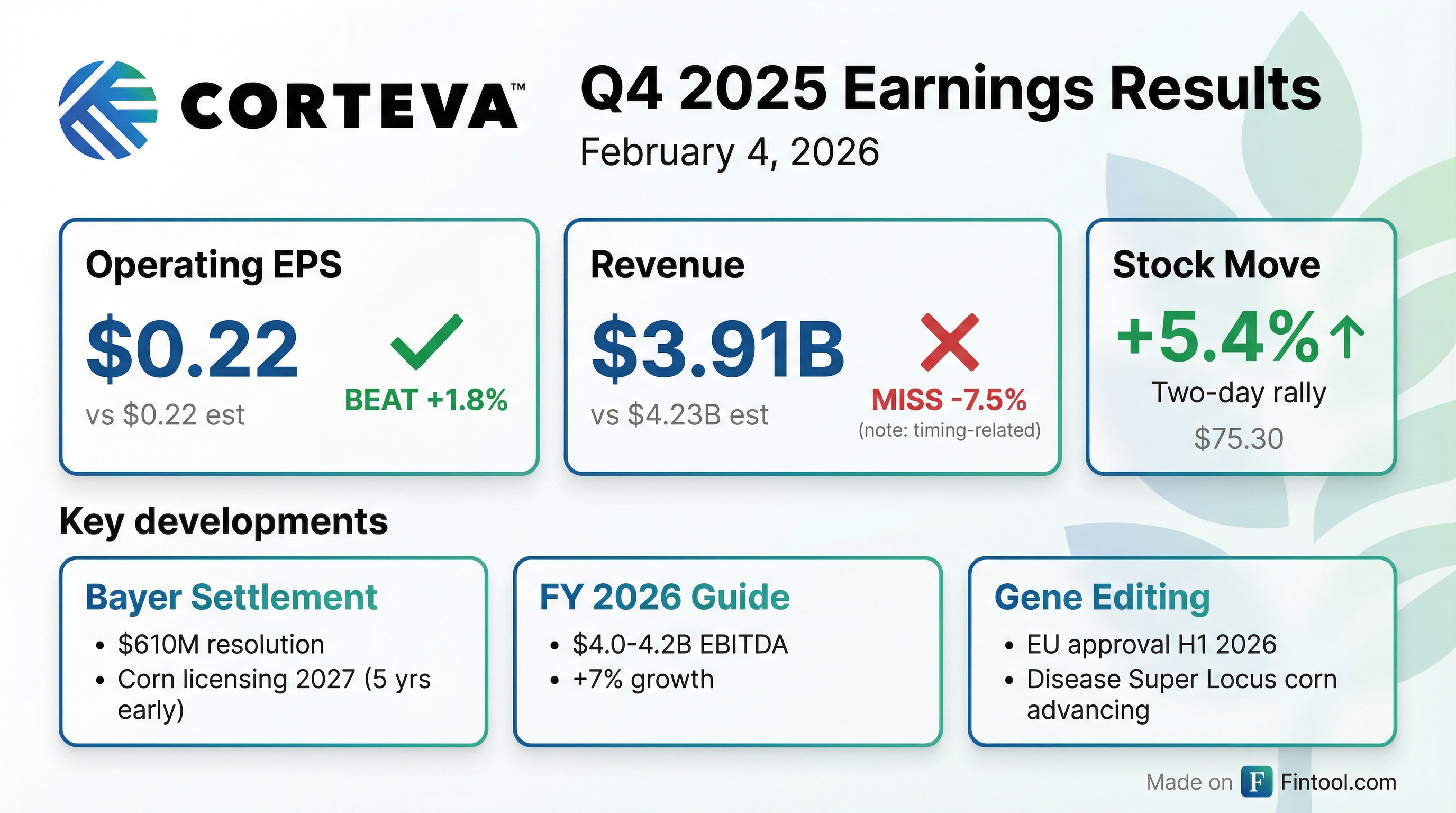- Corteva delivered Q3 net sales of $2.62 B, GAAP loss from continuing operations of $(308) M (EPS $(0.46)), and non-GAAP operating EBITDA of $49 M (operating EPS $(0.23)).
