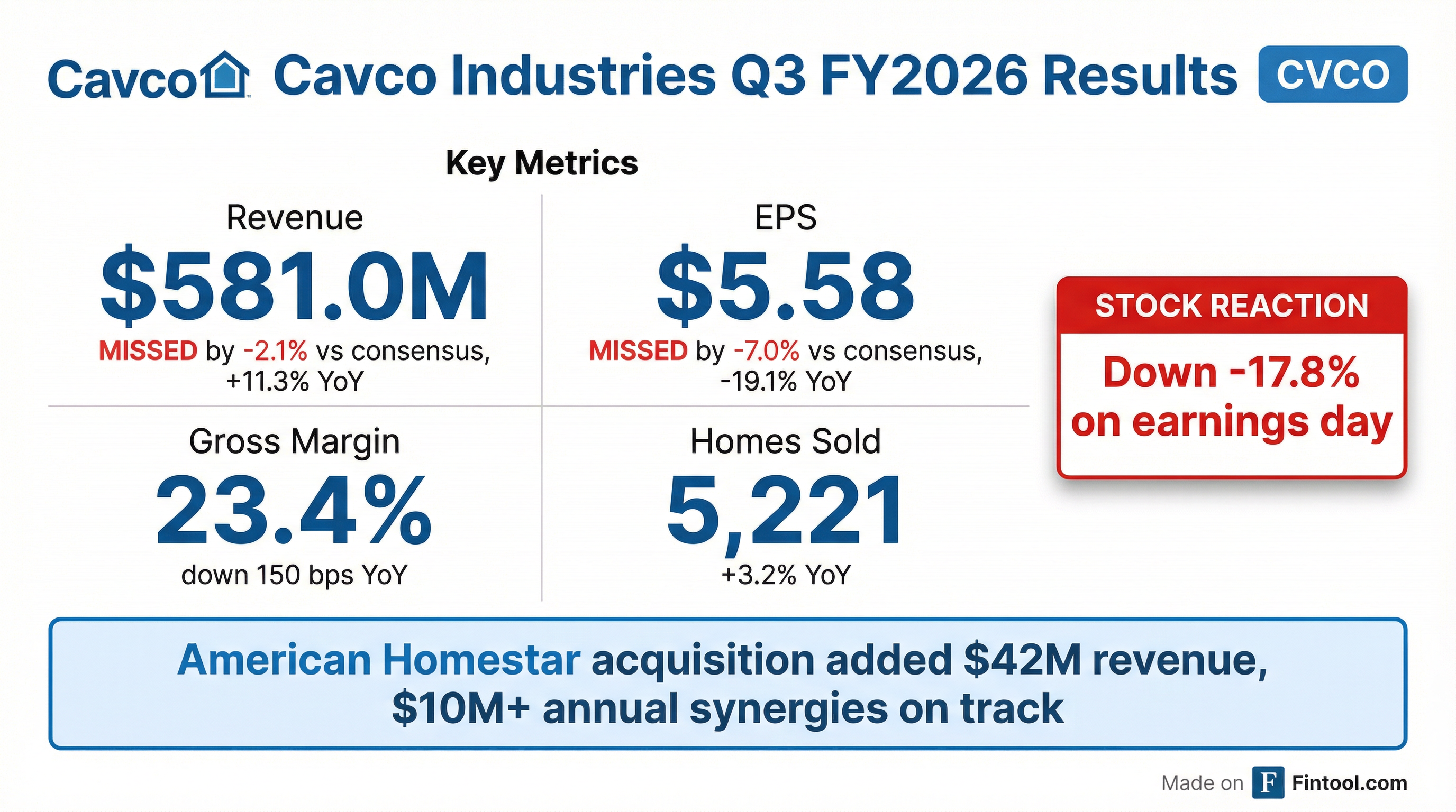 - Cavco Industries reported net revenue of $581 million for Q3 2026, an 11.3% increase year-over-year, driven by the American Homestar acquisition which contributed $42 million.