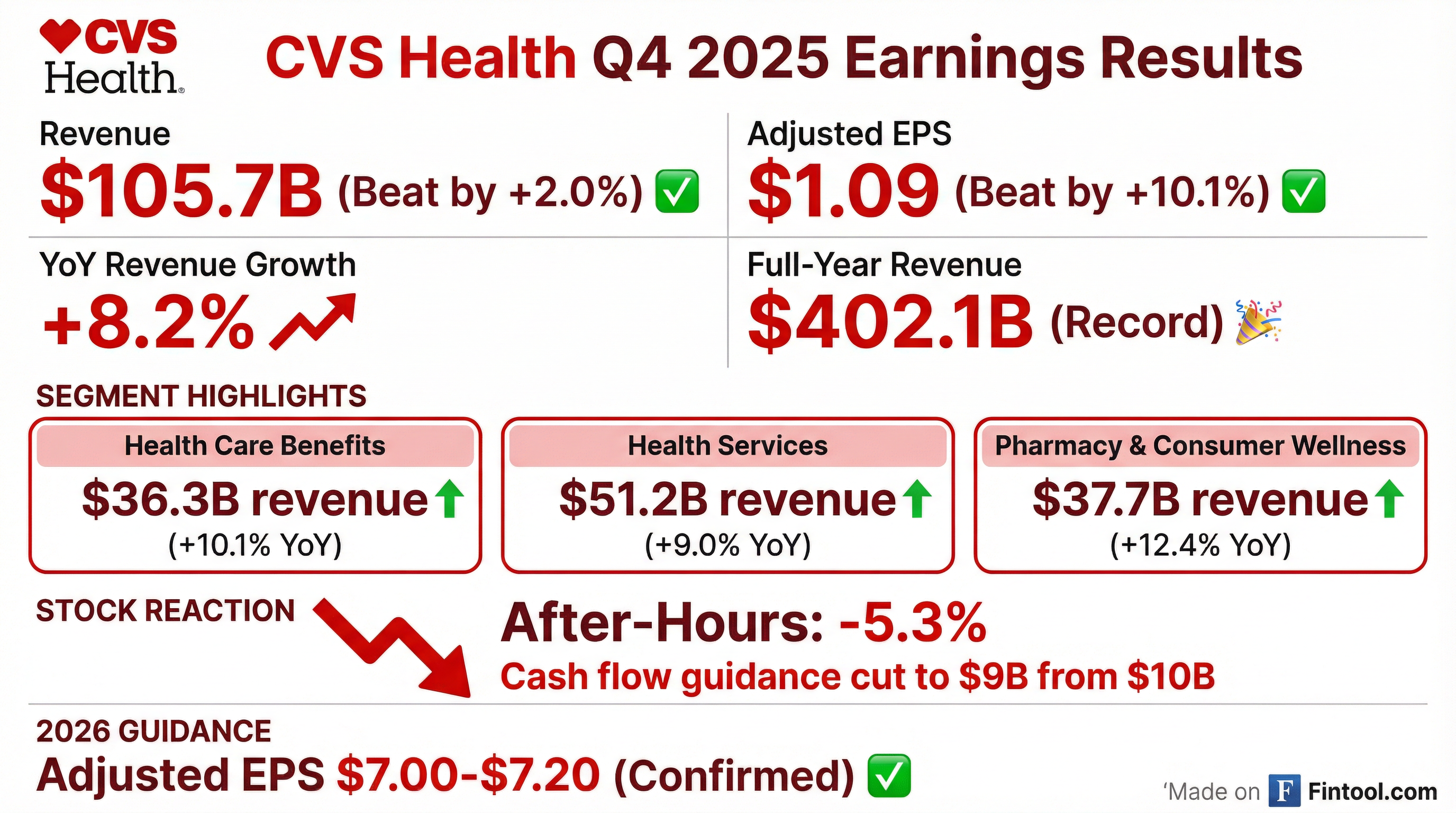 - Q4 segment performance: Health Services revenues grew 9% to $51 billion (AOI +9% to $1.9 billion); Pharmacy & Consumer Wellness revenues rose 12% to $38 billion, with same-store sales +16% and AOI +9% to $1.9 billion.