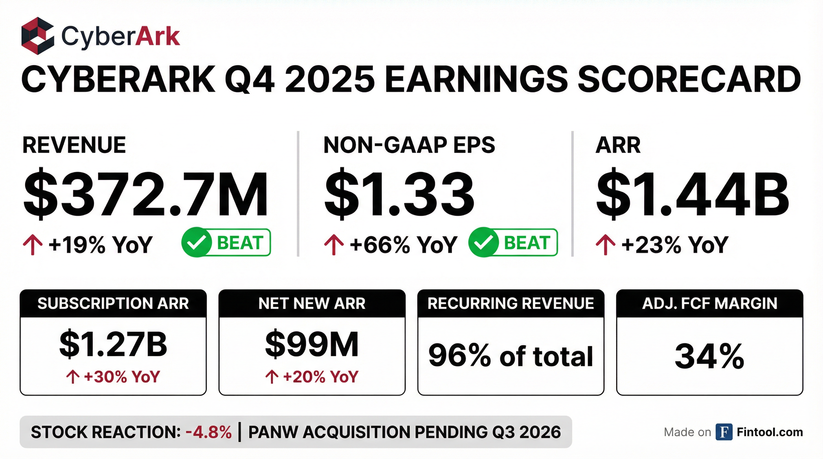 • CyberArk reported record financial results for the fourth quarter and full year ended December 31, 2025, with total revenue reaching $372.7 million in Q4 2025 (up 19% year-over-year) and $1.361 billion for the full year 2025 (up 36% year-over-year).