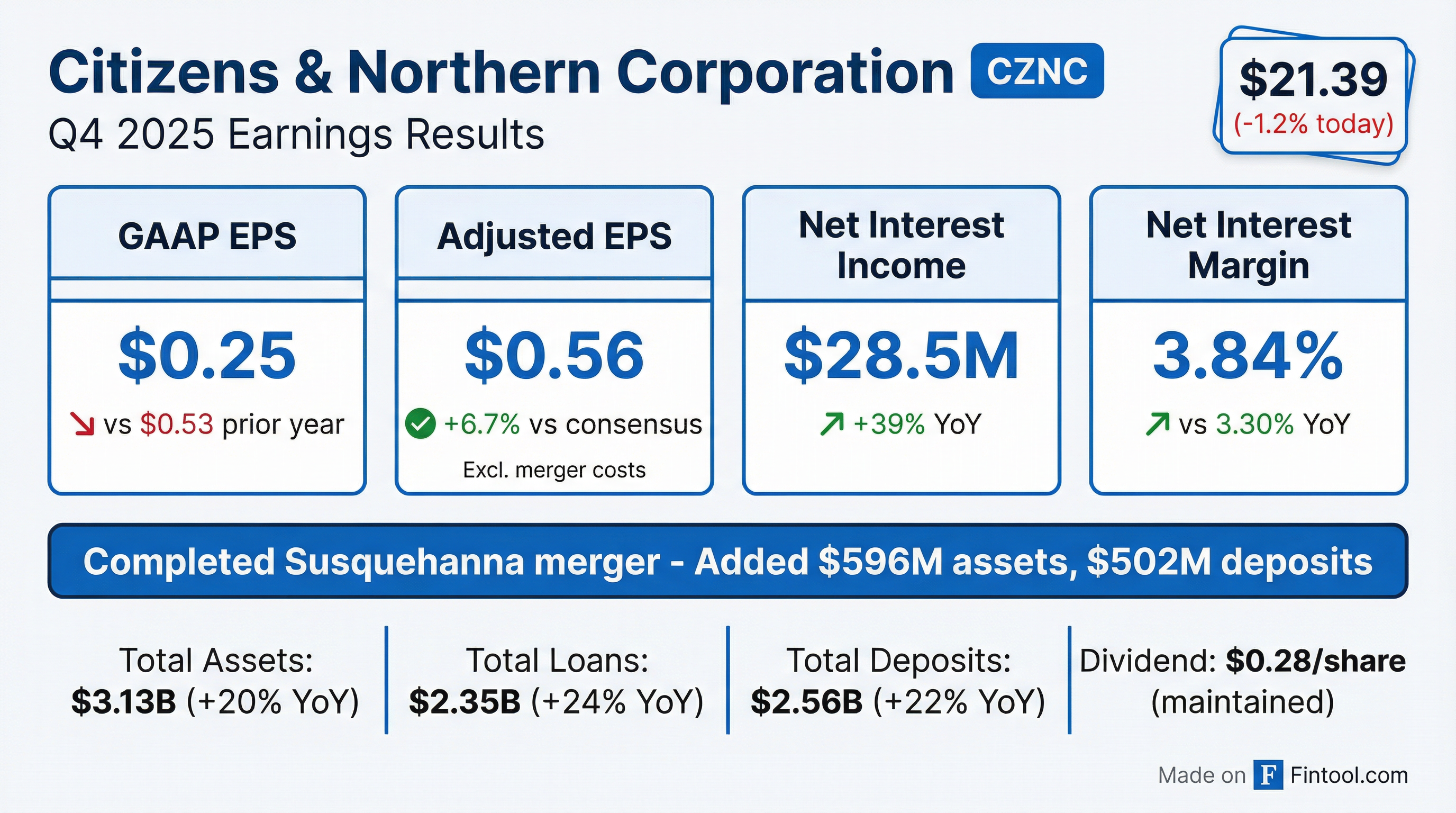 - Citizens & Northern Corporation (CZNC) reported net income of $4.466 million ($0.25 diluted EPS) for the fourth quarter of 2025 and $23.427 million ($1.46 diluted EPS) for the full year 2025.