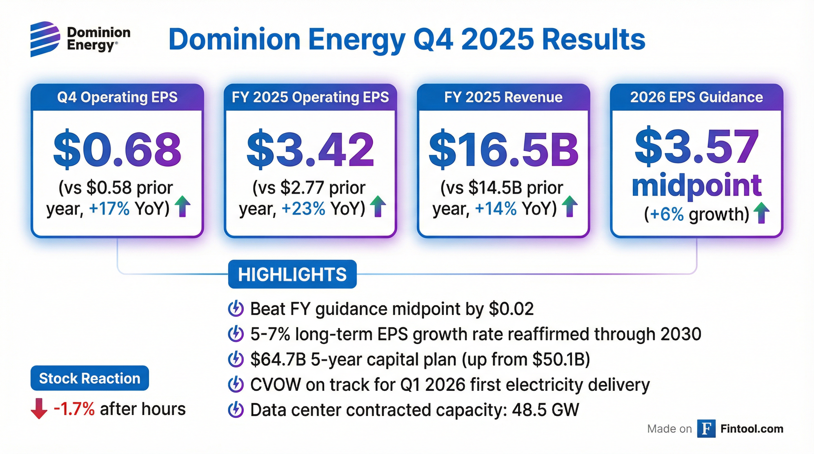 - Dominion delivered 2025 operating EPS of $3.42 ($3.33 ex-RNG credits), above the guidance midpoint, and set 2026 operating EPS guidance of $3.40–$3.60 (midpoint $3.50), a 6.1% increase on a comparable basis.