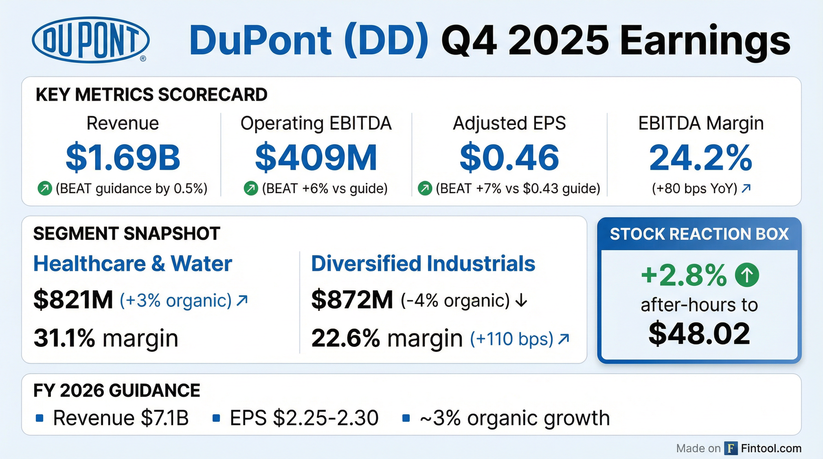 - DuPont reported Q4 2025 net sales of $1.693 billion, flat YoY, with operating EBITDA of $409 million, up 4% YoY, and a margin expansion of 80 bps to 24.2%.