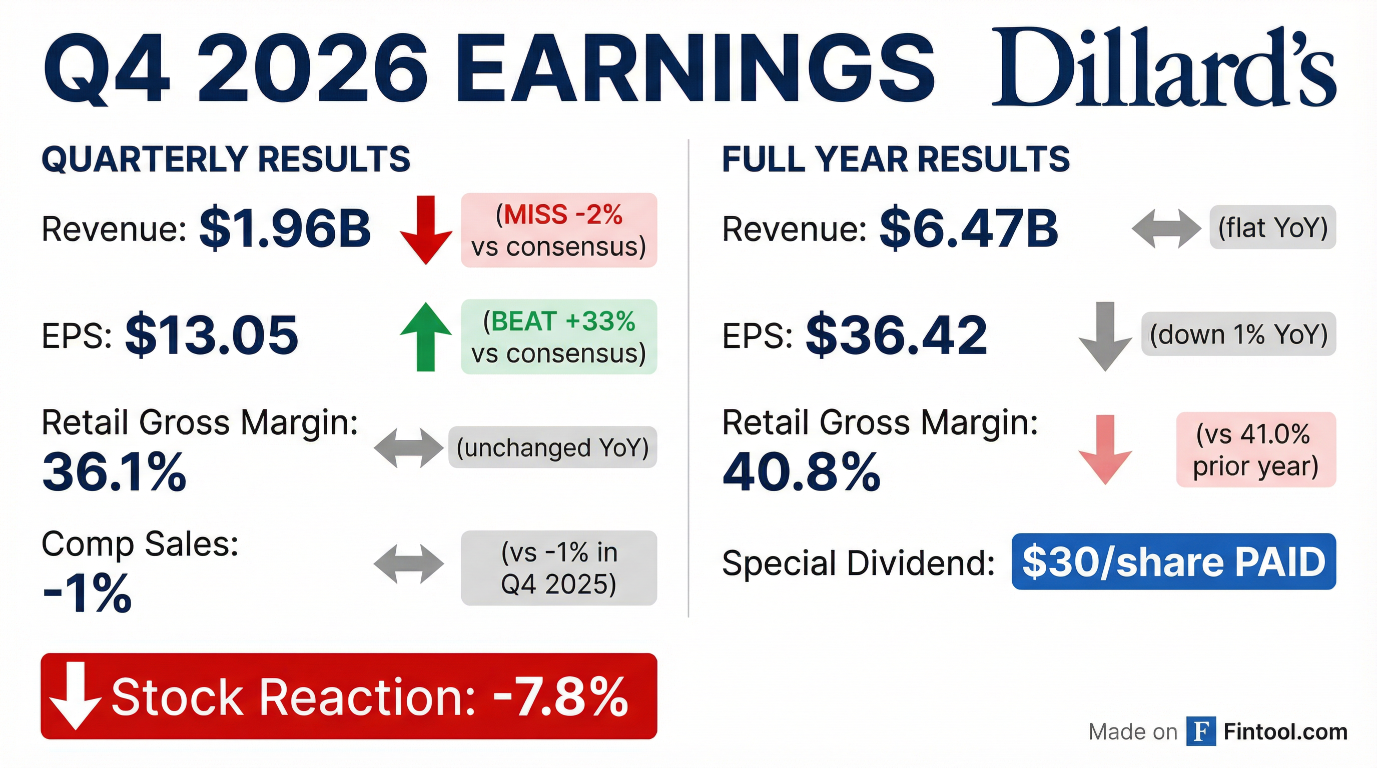 - Dillard's reported net income of $570.2 million and earnings per share of $36.42 for the fiscal year ended January 31, 2026, compared to $593.5 million and $36.82, respectively, in the prior fiscal year.