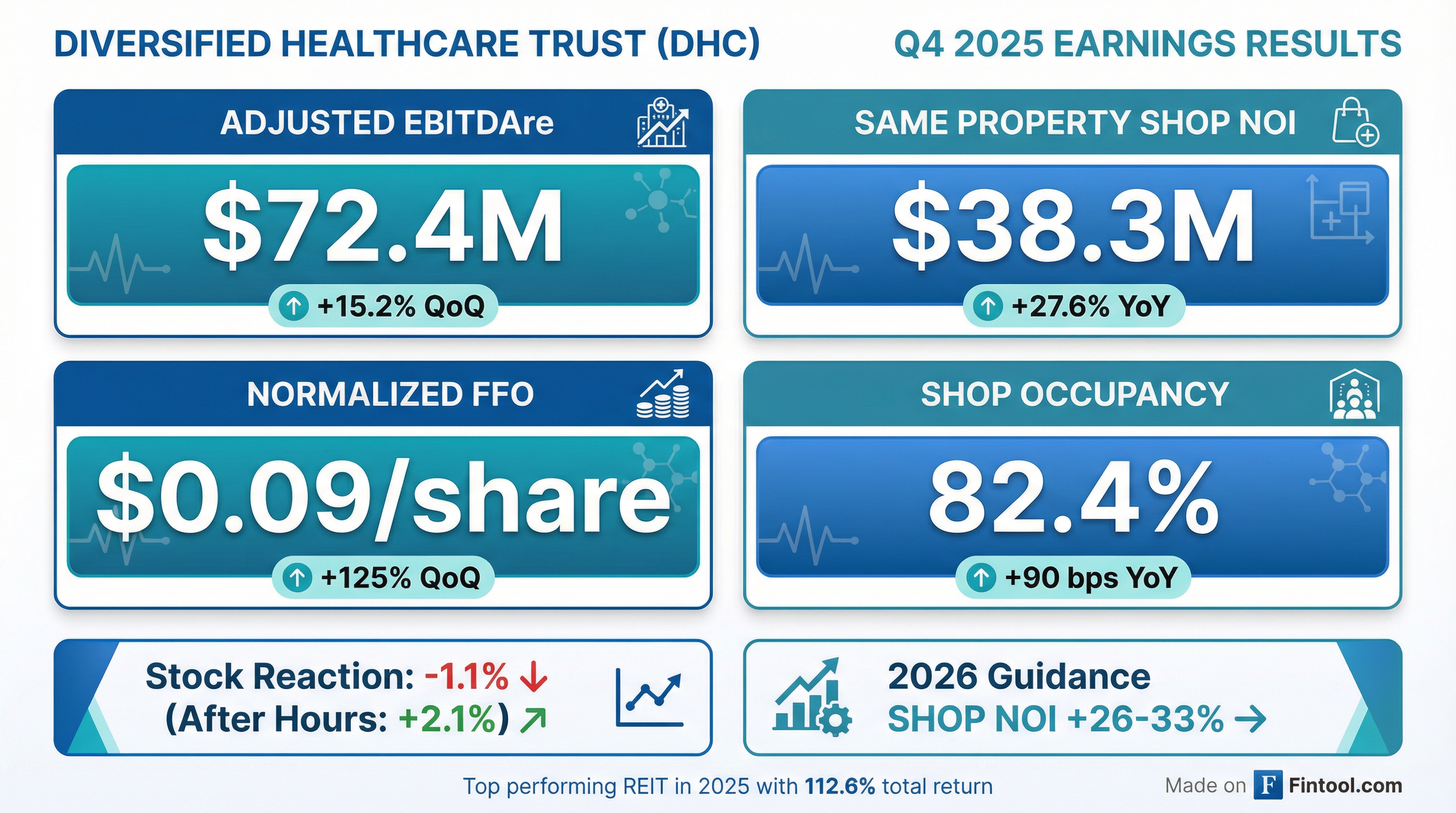- Diversified Healthcare Trust reported strong financial performance for Q4 2025, with same property SHOP NOI increasing 27.6% to $38.3 million and full year SHOP NOI growing 31.3% to $139.3 million.