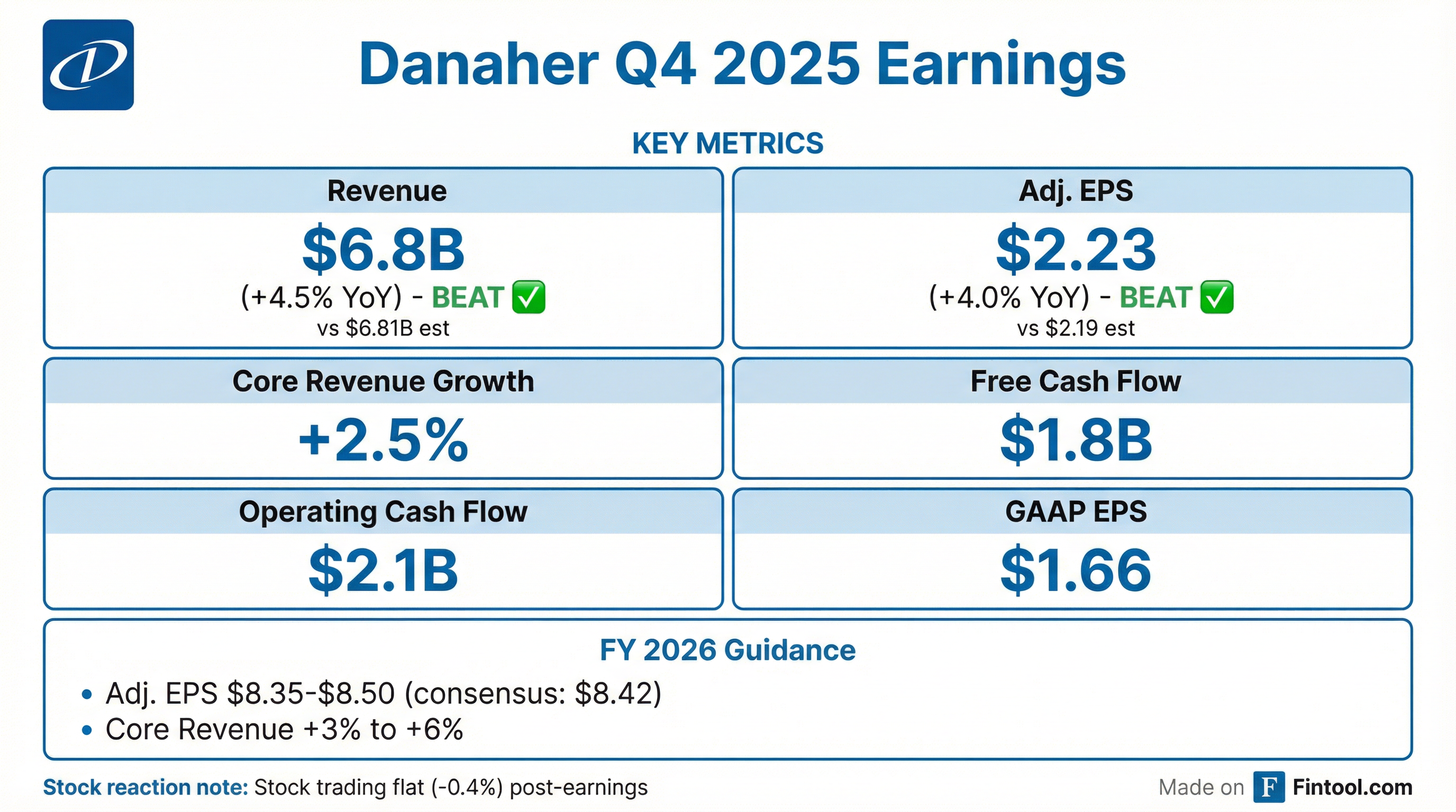 - Danaher delivered Q4 2025 sales of $6.8 B (core revenue +2.5%), adjusted EPS $2.23 (+4%), and free cash flow $1.8 B.