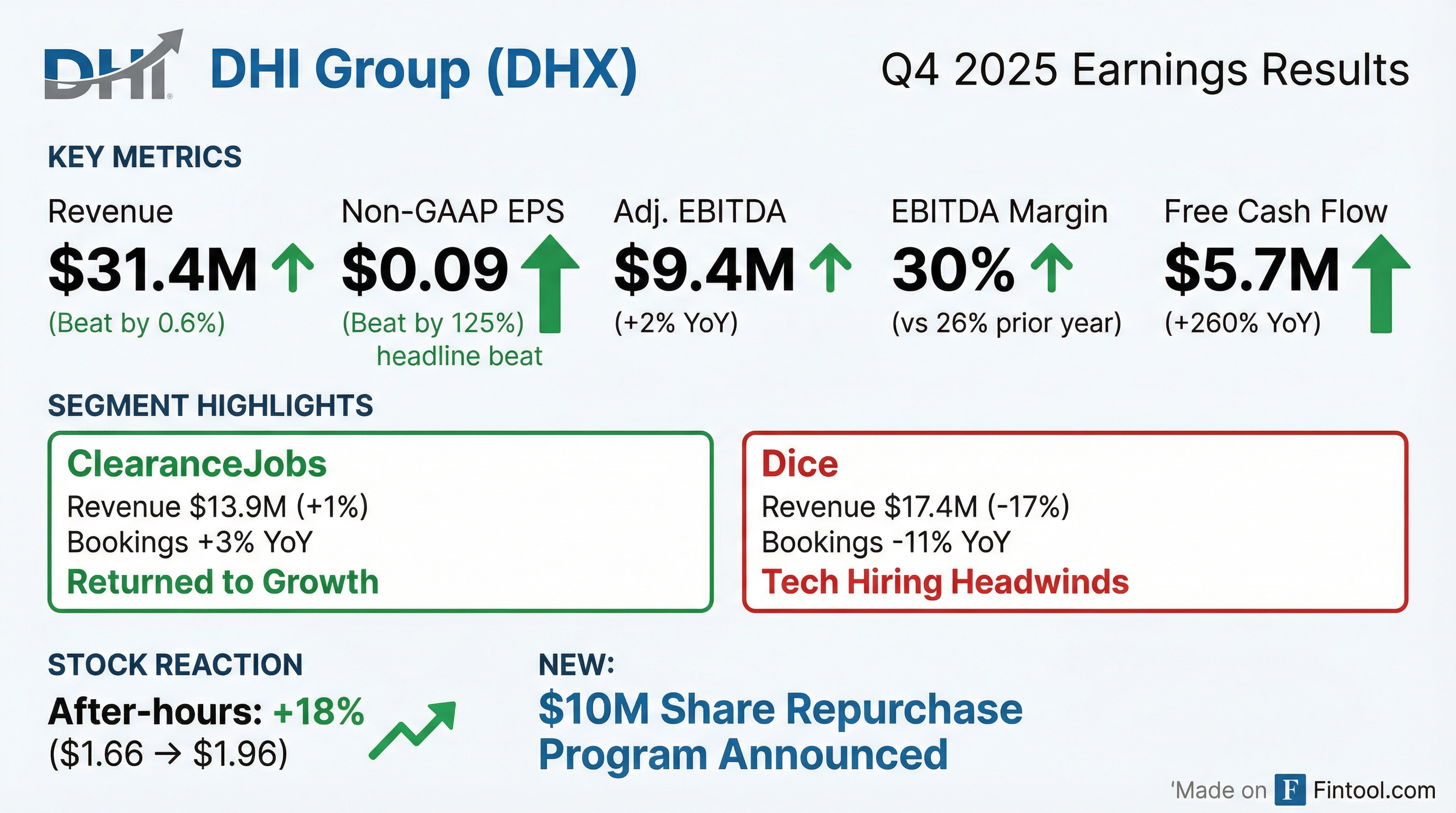 - DHI Group reported net income of $1.3 million ($0.03 per diluted share) and Adjusted EBITDA of $9.4 million (30% margin) for Q4 2025. Free cash flow for the quarter was $5.7 million, contributing to a full-year 2025 free cash flow of $13.8 million.