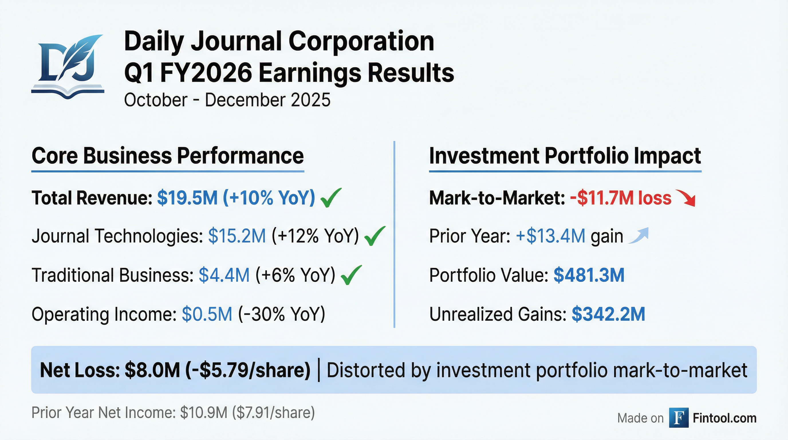 - Daily Journal Corporation reported total consolidated revenue of $19.5 million for the three months ended December 31, 2025 (Q1 Fiscal 2026), representing a 10% increase year-over-year, primarily driven by growth at Journal Technologies.