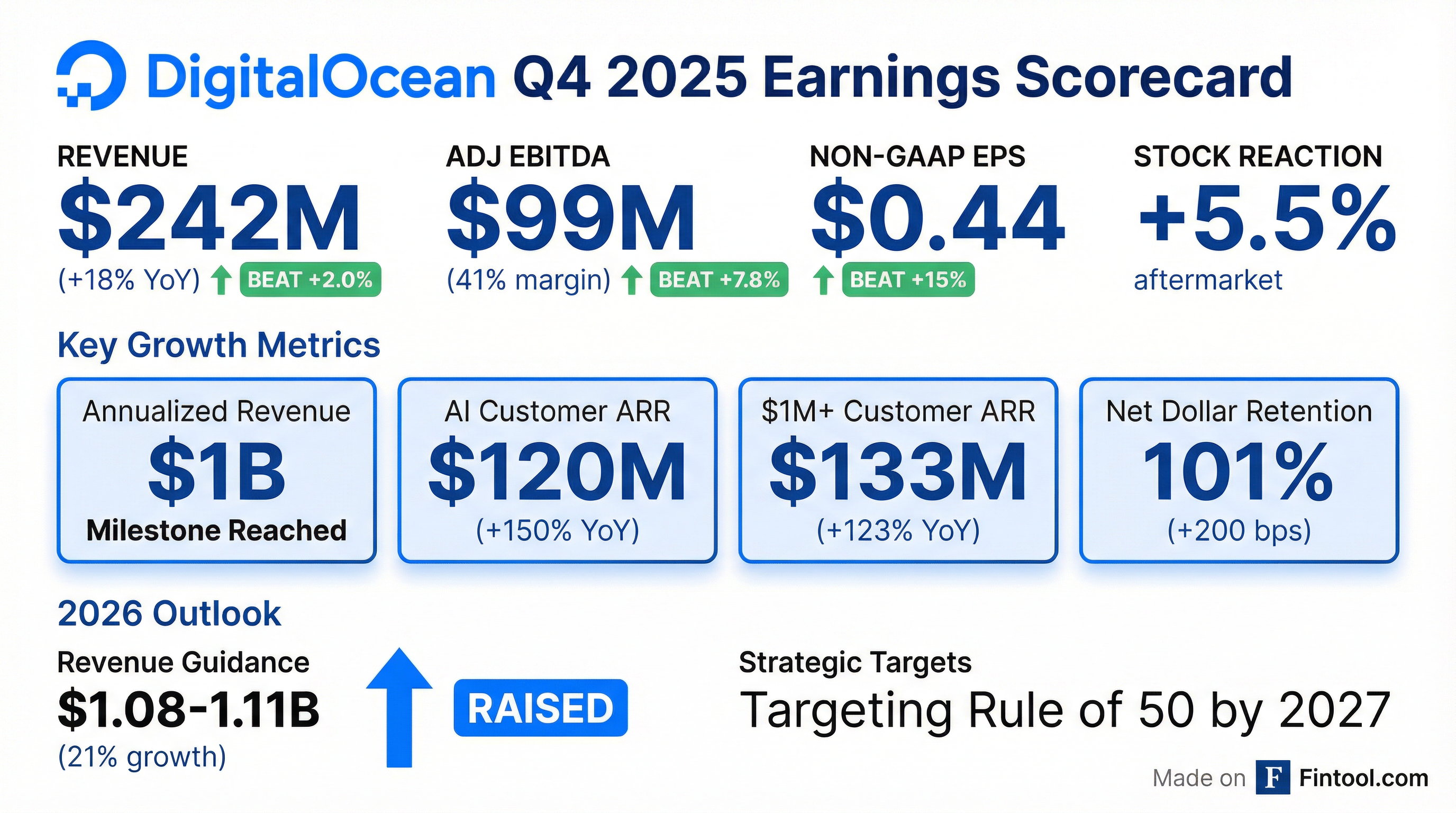 - DigitalOcean reported Q4 2025 revenue of $242 million, an 18% year-over-year increase, contributing to a full-year 2025 revenue of $901 million and 42% adjusted EBITDA margins.