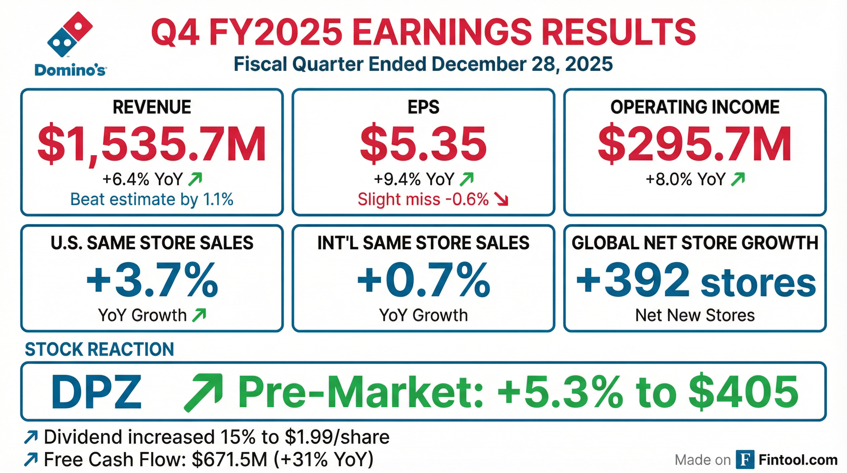 Earnings summaries and quarterly performance for DOMINOS PIZZA.
