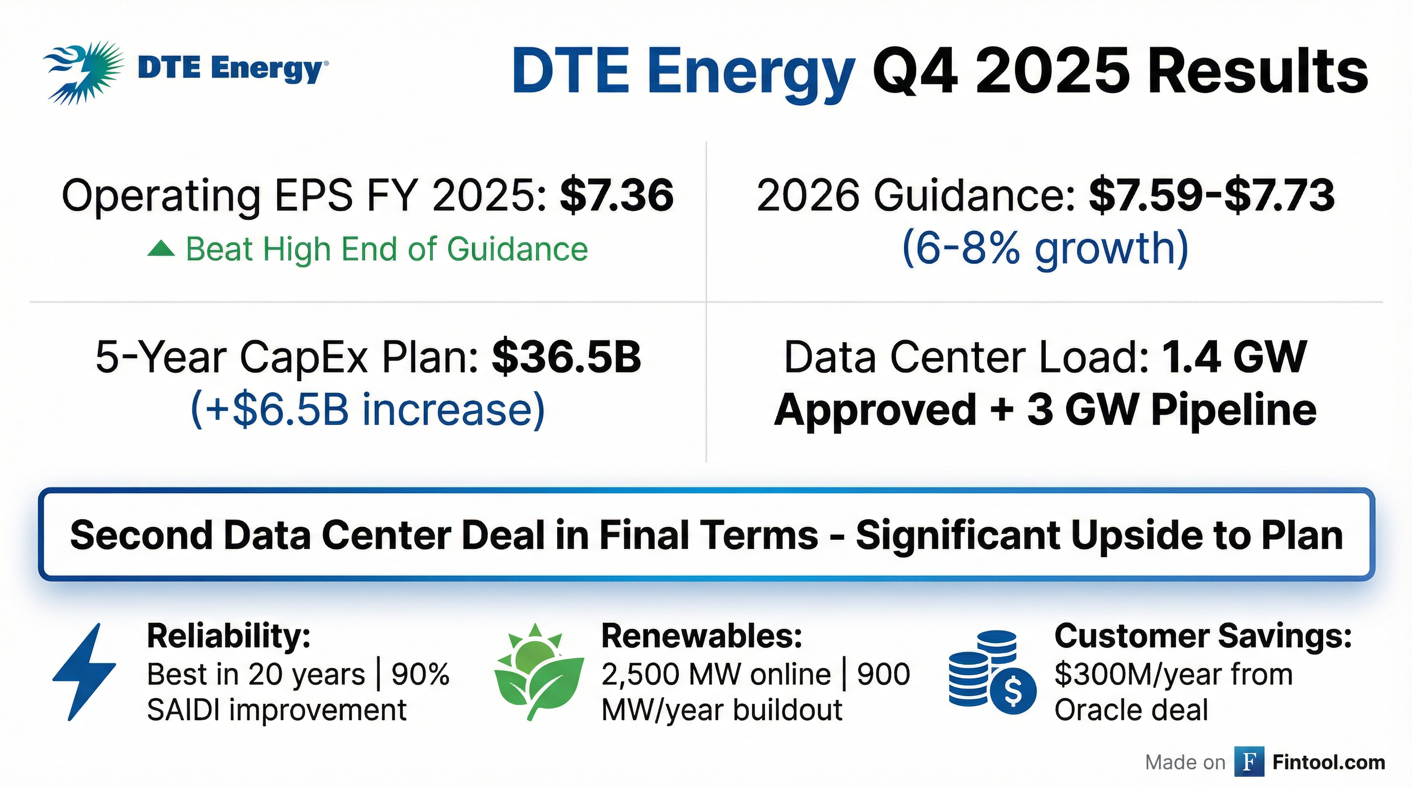 - DTE delivered operating EPS of $7.36 in 2025, above the high end of its original guidance range.