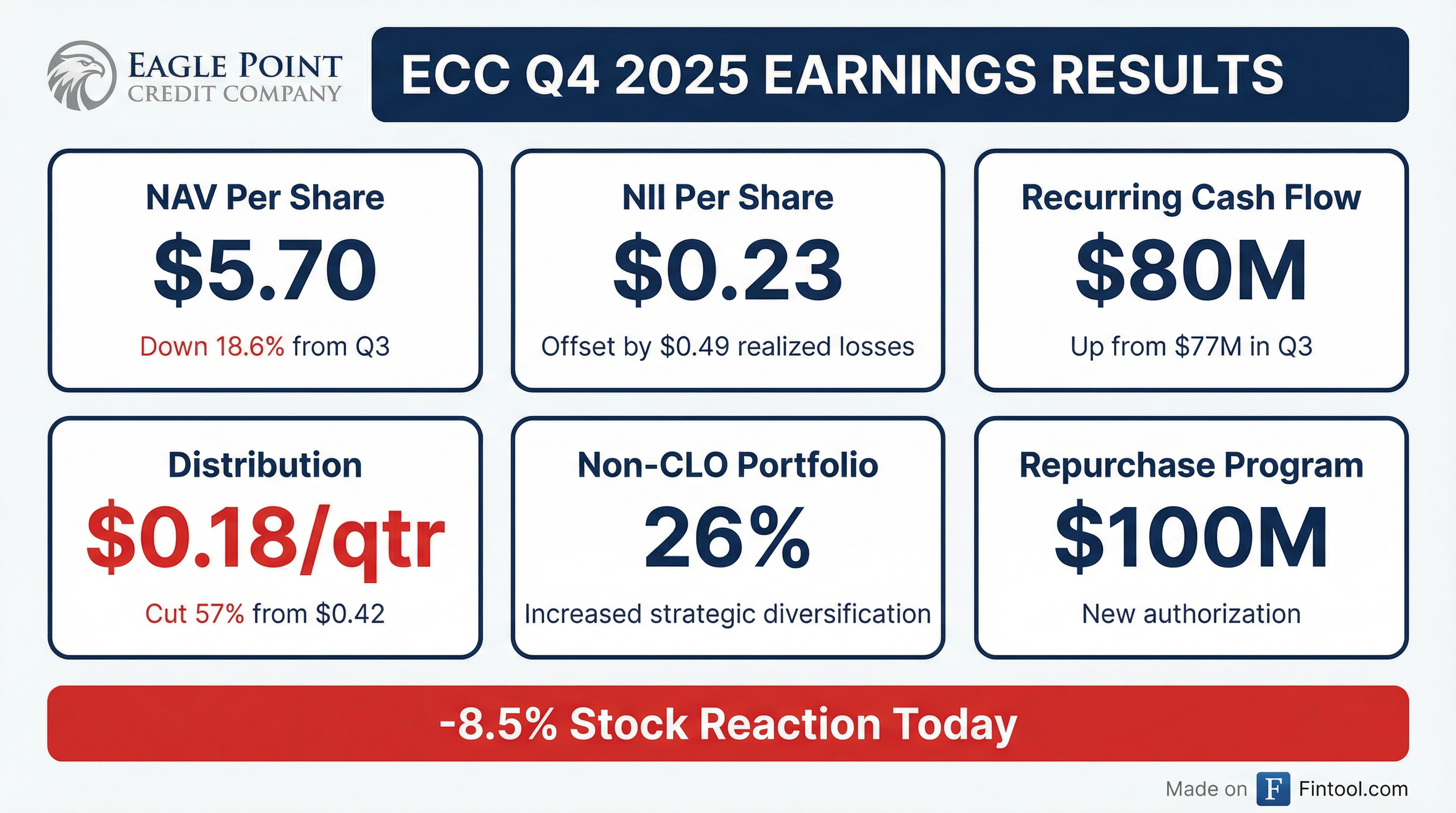 - Eagle Point Credit Company Inc. reported a Net Asset Value (NAV) per common share of $5.70 as of December 31, 2025, compared to $7.00 as of September 30, 2025, and a GAAP net loss attributable to common stock of $109.9 million for the fourth quarter of 2025.