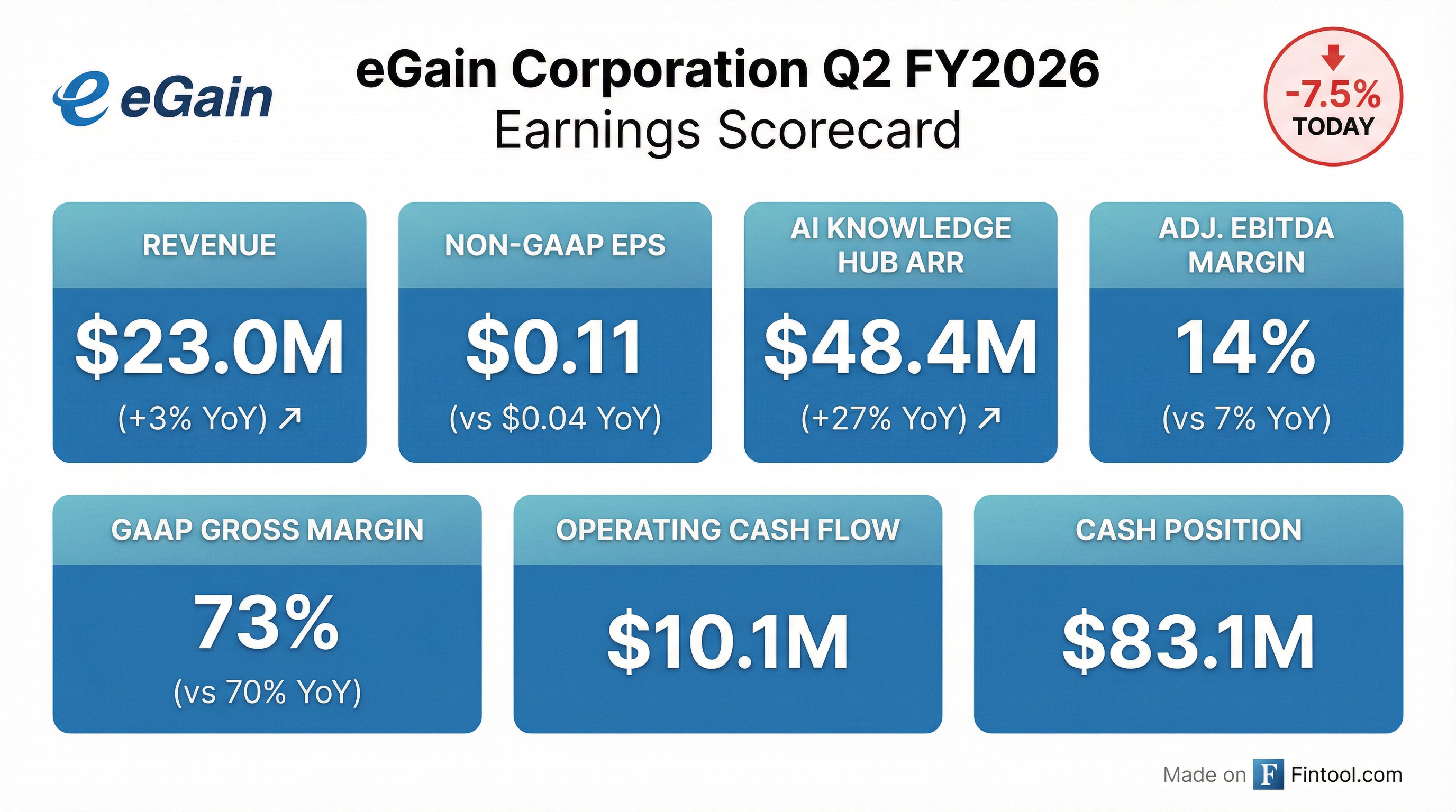- eGain reported Q2 2026 total revenue of $23 million, an increase of 3% year-over-year, and non-GAAP net income of $3 million or $0.11 per share, both exceeding guidance and street consensus. The company also generated strong operating cash flow of $10.1 million, ending the quarter with $83.1 million in cash and cash equivalents.