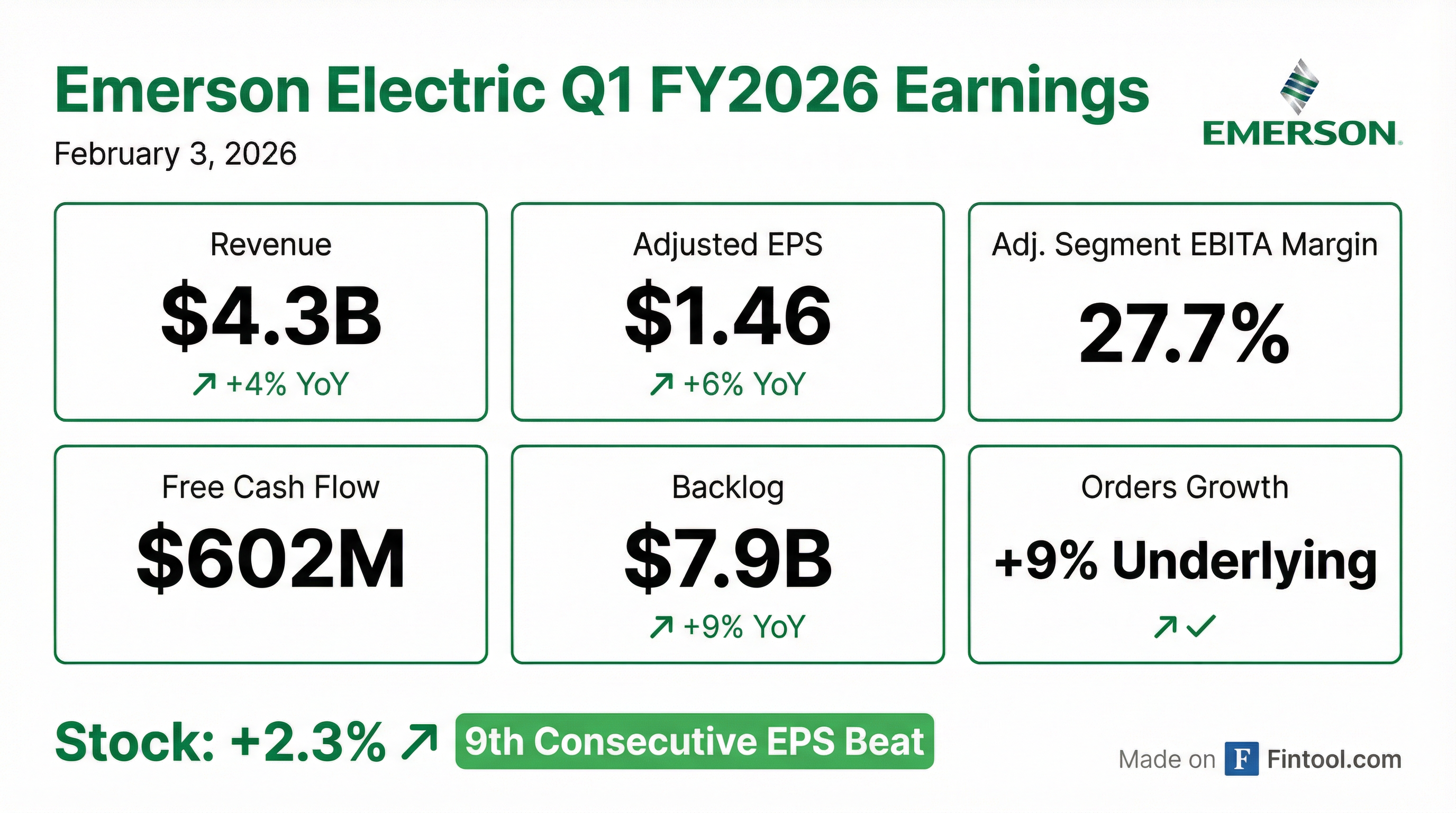 - Emerson reported Q1 FY2026 net sales of $4.346 billion (up 4% yoy), with underlying orders growth of 9% and underlying sales up 2%.