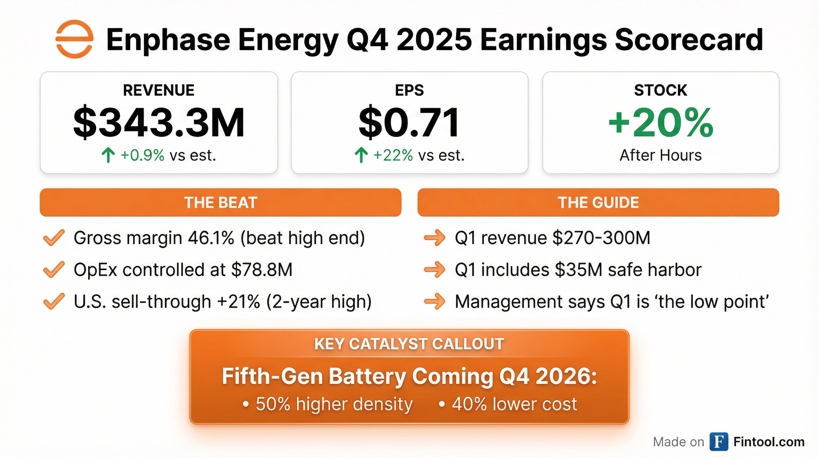 - Enphase reported Q4 revenue of $343.3 million, shipping 682.6 MW DC of microinverters and 150.1 MWh of IQ batteries; non-GAAP gross margin was 46.1% and non-GAAP EPS $0.71 (GAAP EPS $0.29).