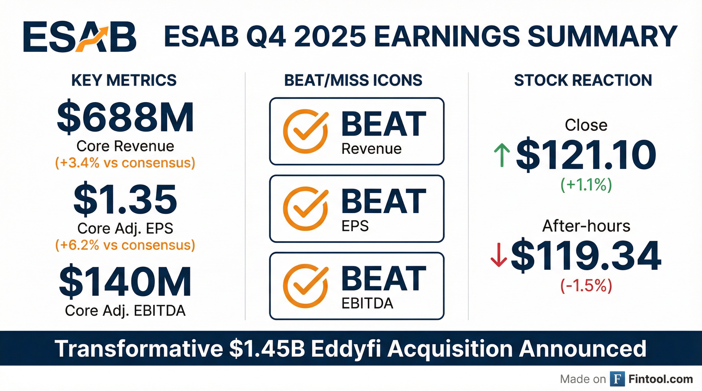 - For Q4 2025, ESAB reported sales of $687 - $689 million and adjusted EBITDA of $139 - $141 million, with an adjusted EBITDA margin of 20.2 - 20.5%.