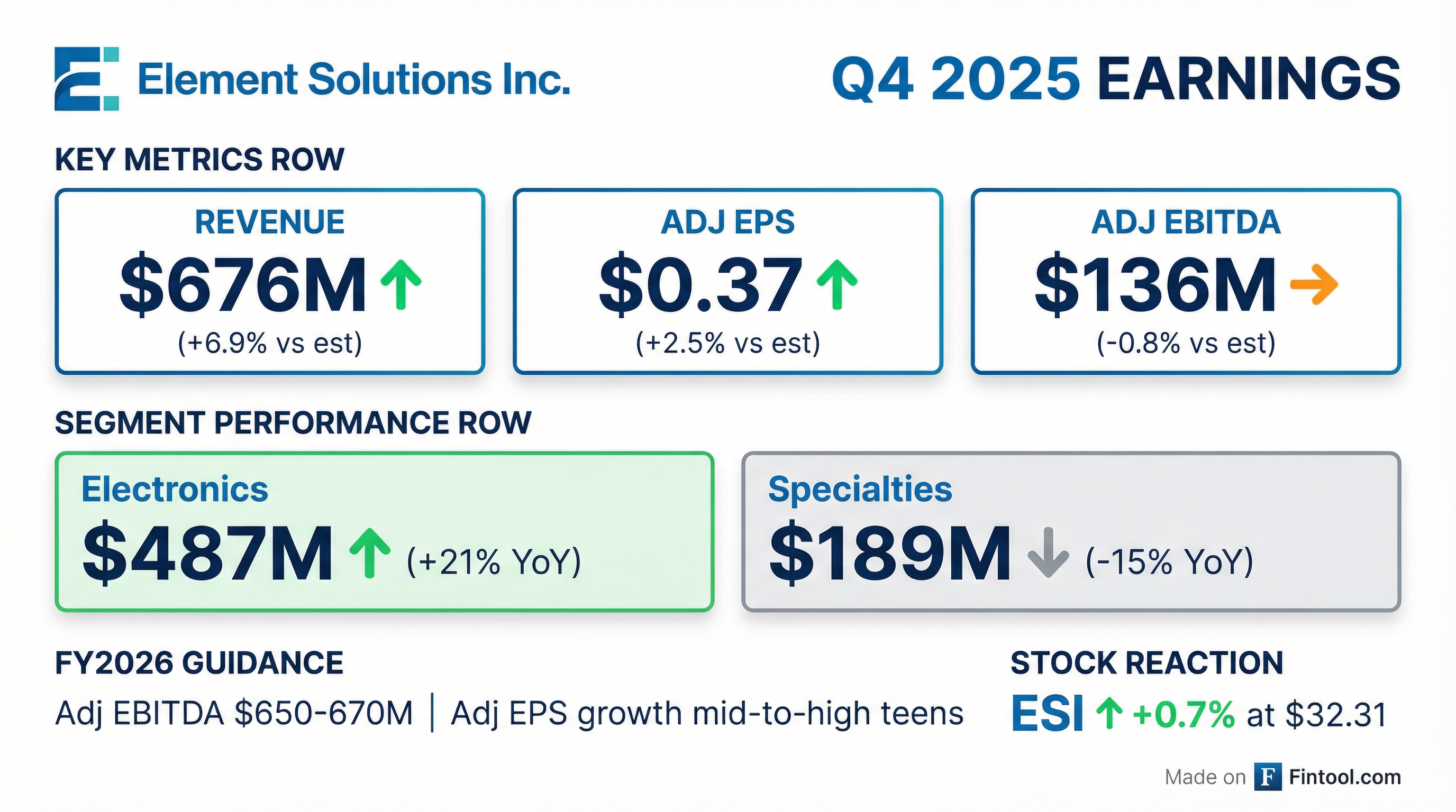 - Element Solutions reported record full-year 2025 net sales of $2,551 million, adjusted EBITDA of $548 million, and adjusted EPS of $1.49. For Q4 2025, net sales were $676 million, adjusted EBITDA was $136 million, and adjusted EPS was $0.37.