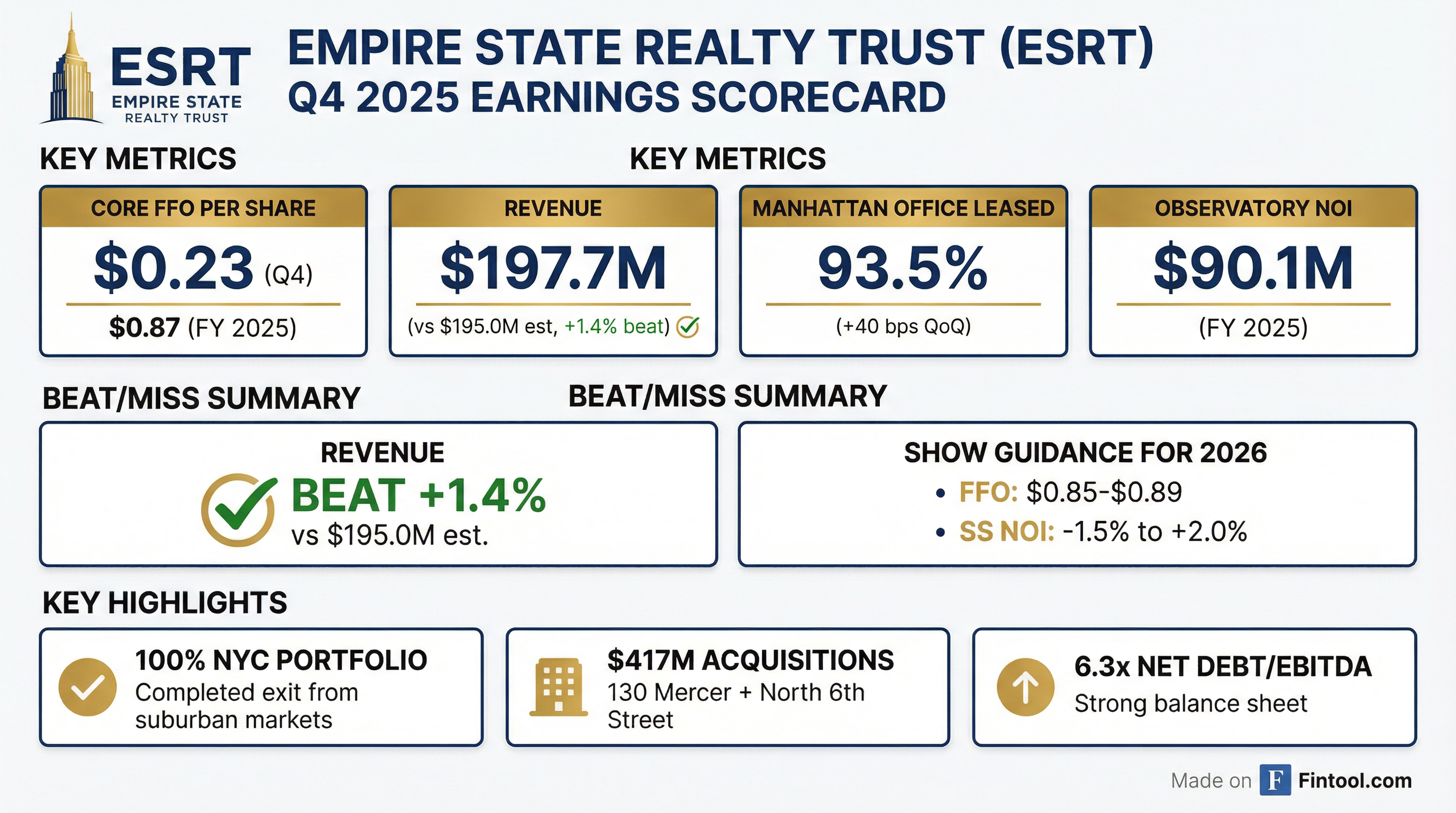 - Empire State Realty Trust (ESRT) reported its financial results for the fourth quarter and full year 2025, and provided its outlook for 2026. Key per share metrics are detailed in the table below :