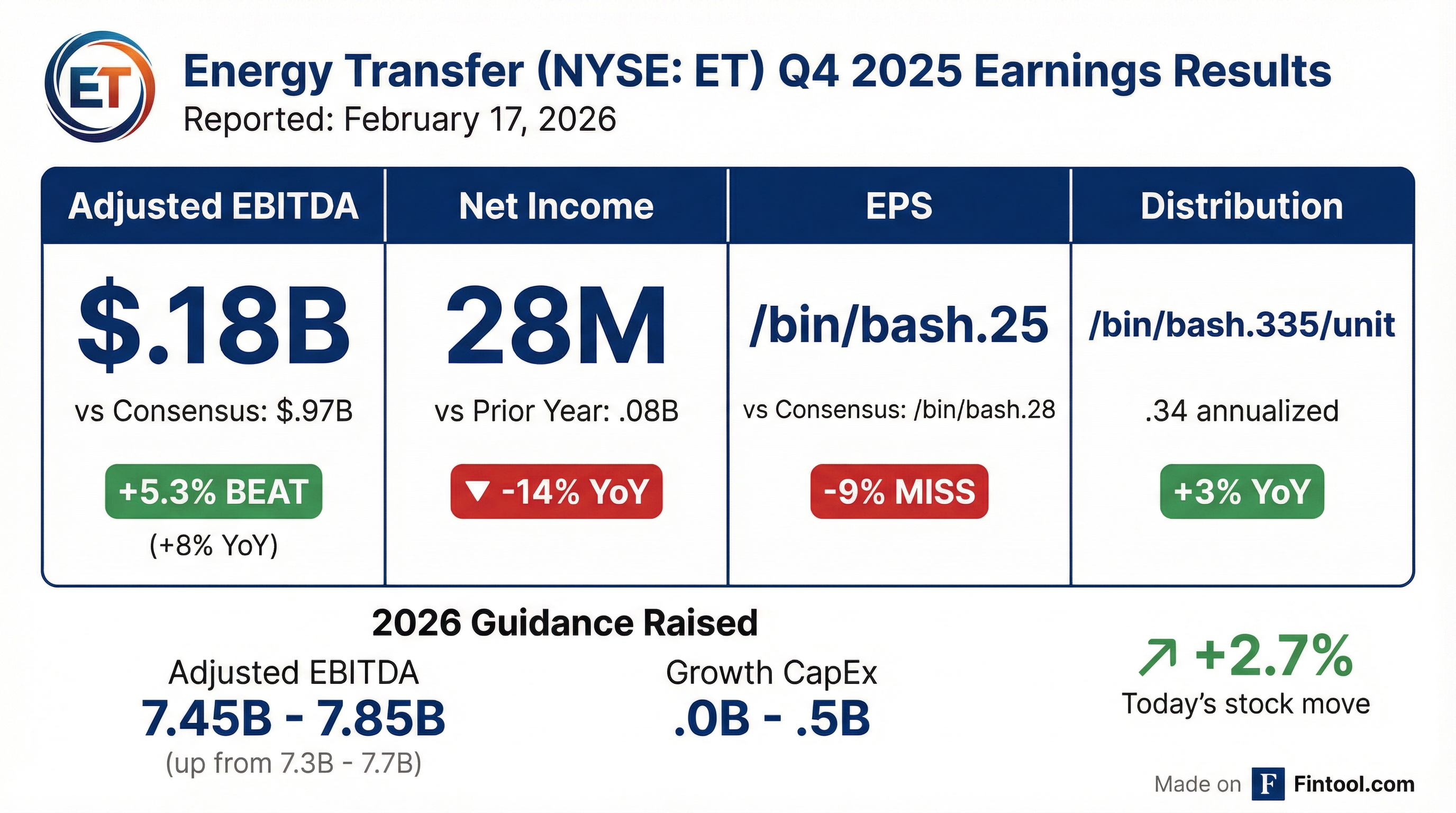 - Energy Transfer reported Adjusted EBITDA of $4.18 billion for the fourth quarter of 2025, an 8% increase compared to the same period last year, and Distributable Cash Flow attributable to partners of $2.04 billion.