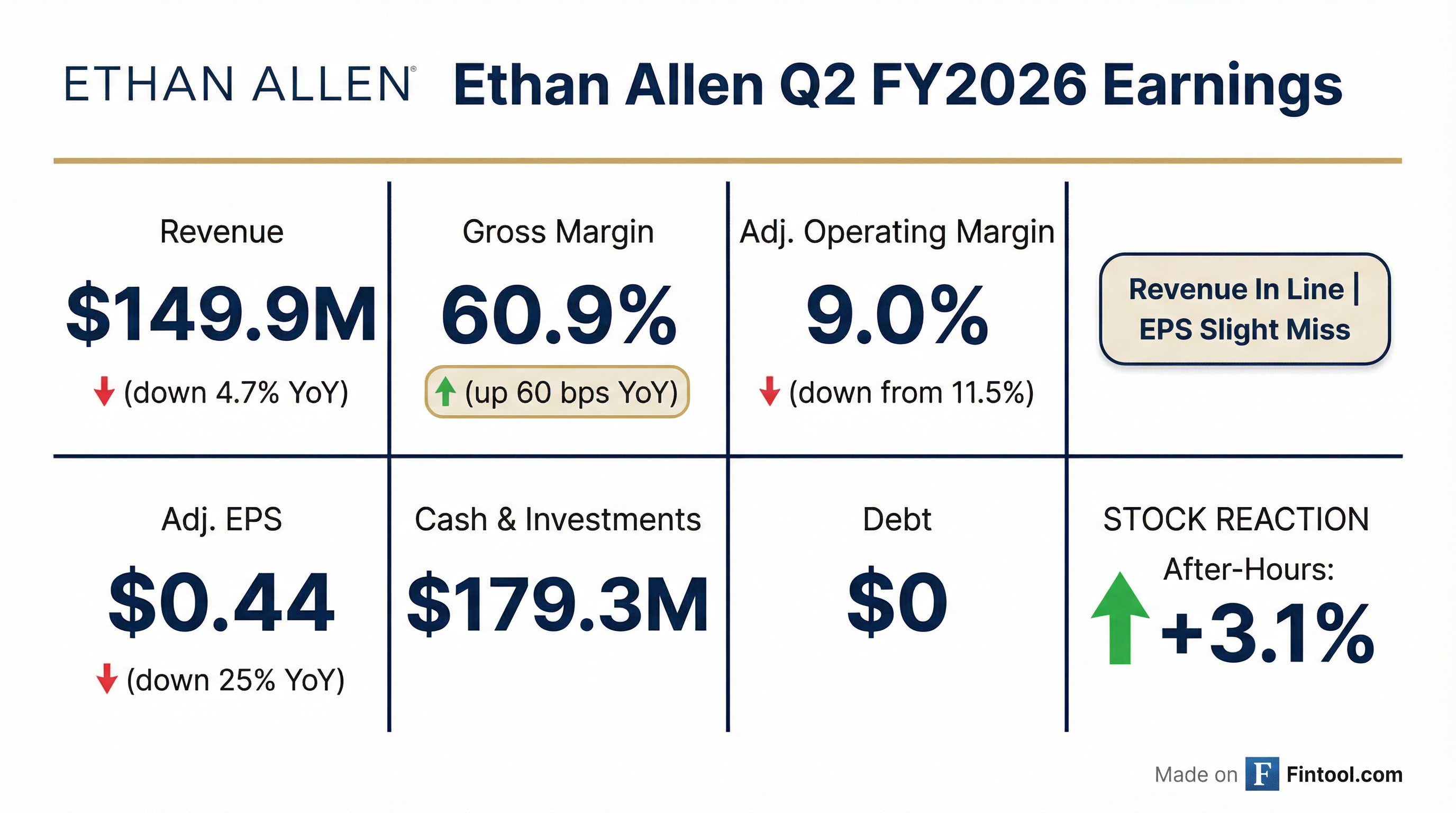 - Ethan Allen (ETD) reported Q2 2026 net sales of $149.9 million, a 60.9% consolidated gross margin, and adjusted diluted EPS of $0.44.