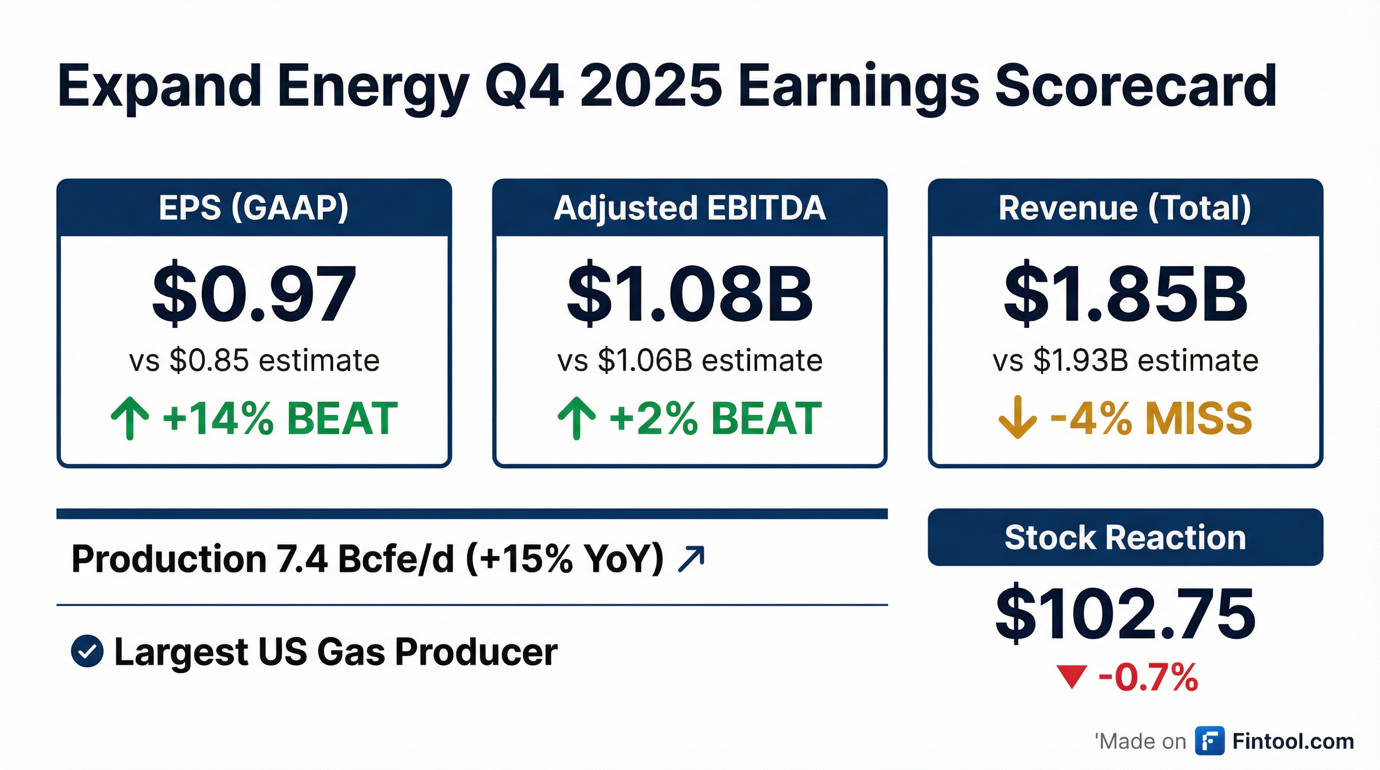 - EXPAND ENERGY reported Adjusted EBITDAX of $1,425 million for Q4 2025 and $5,078 million for FY 2025, with Net Income of $553 million for Q4 2025 and $1,819 million for FY 2025.