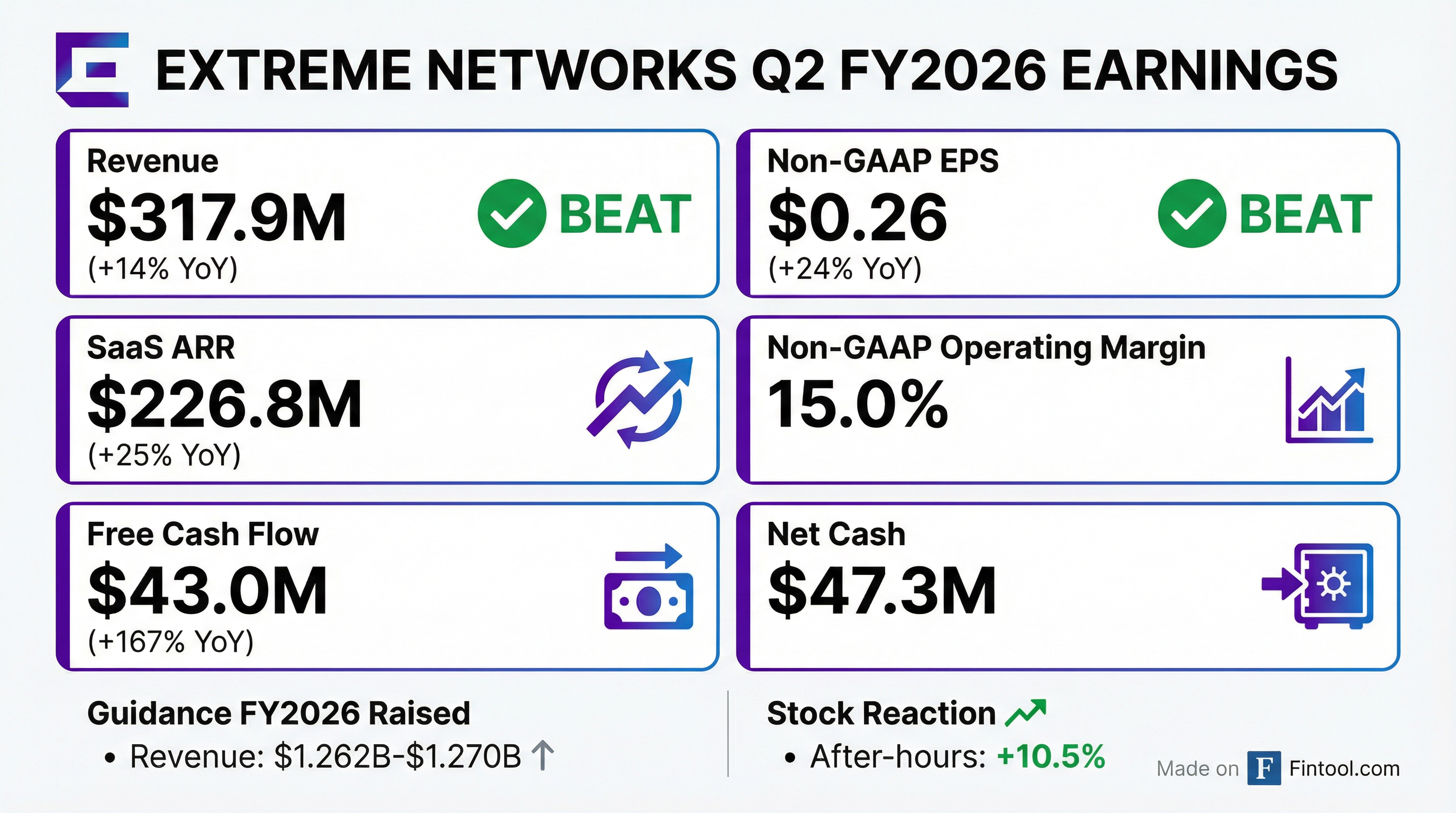 - Extreme Networks reported Q2 2026 revenue of $318 million, a 14% year-over-year increase, and EPS of $0.26, a 24% year-over-year improvement, both exceeding guidance.