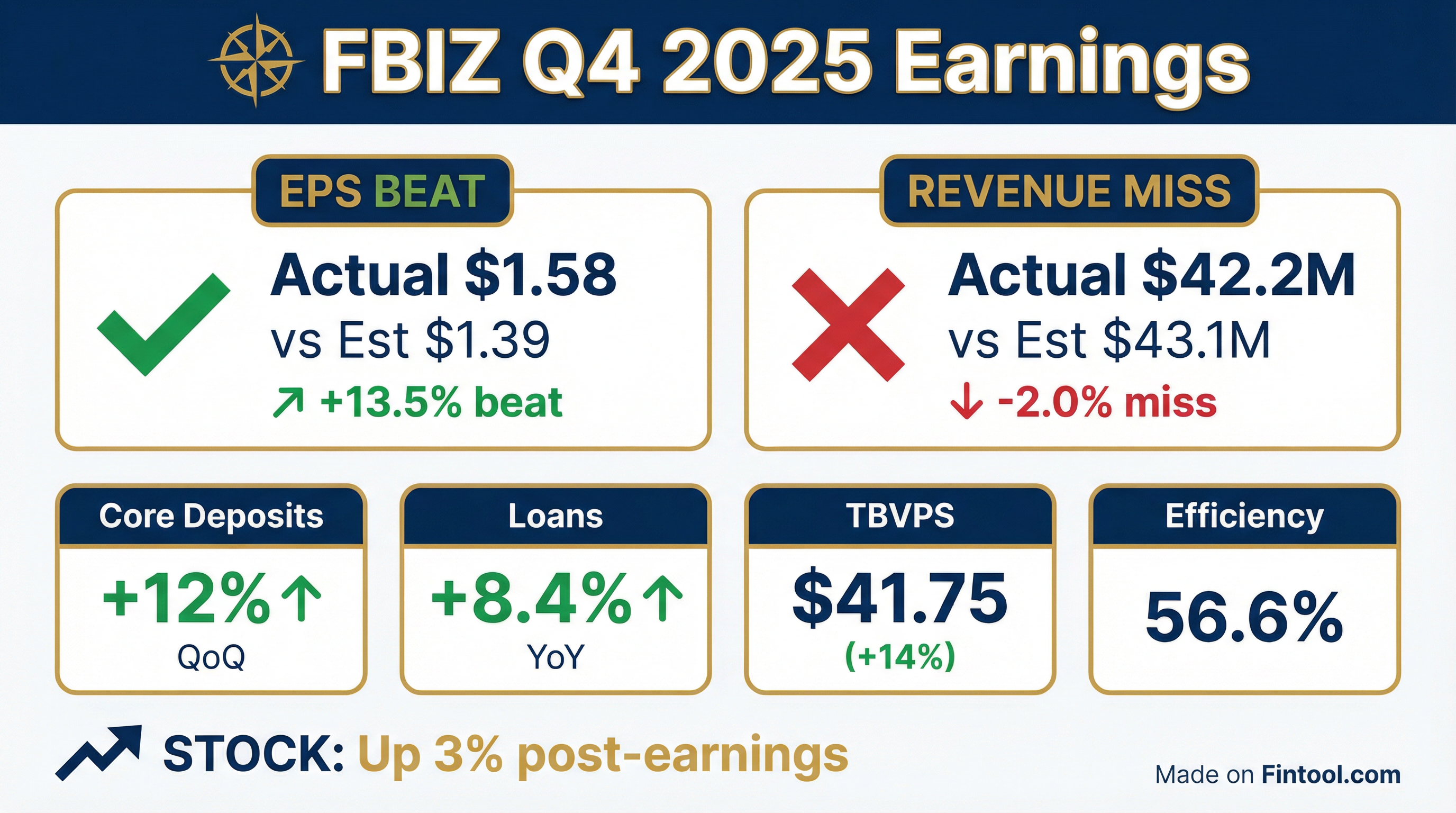 - First Business Bank (FBIZ) reported 14% annual EPS growth for 2025, surpassing its long-term goal of 10%, and achieved a full-year efficiency ratio of 58.78%, an improvement from 60.61% in 2024.