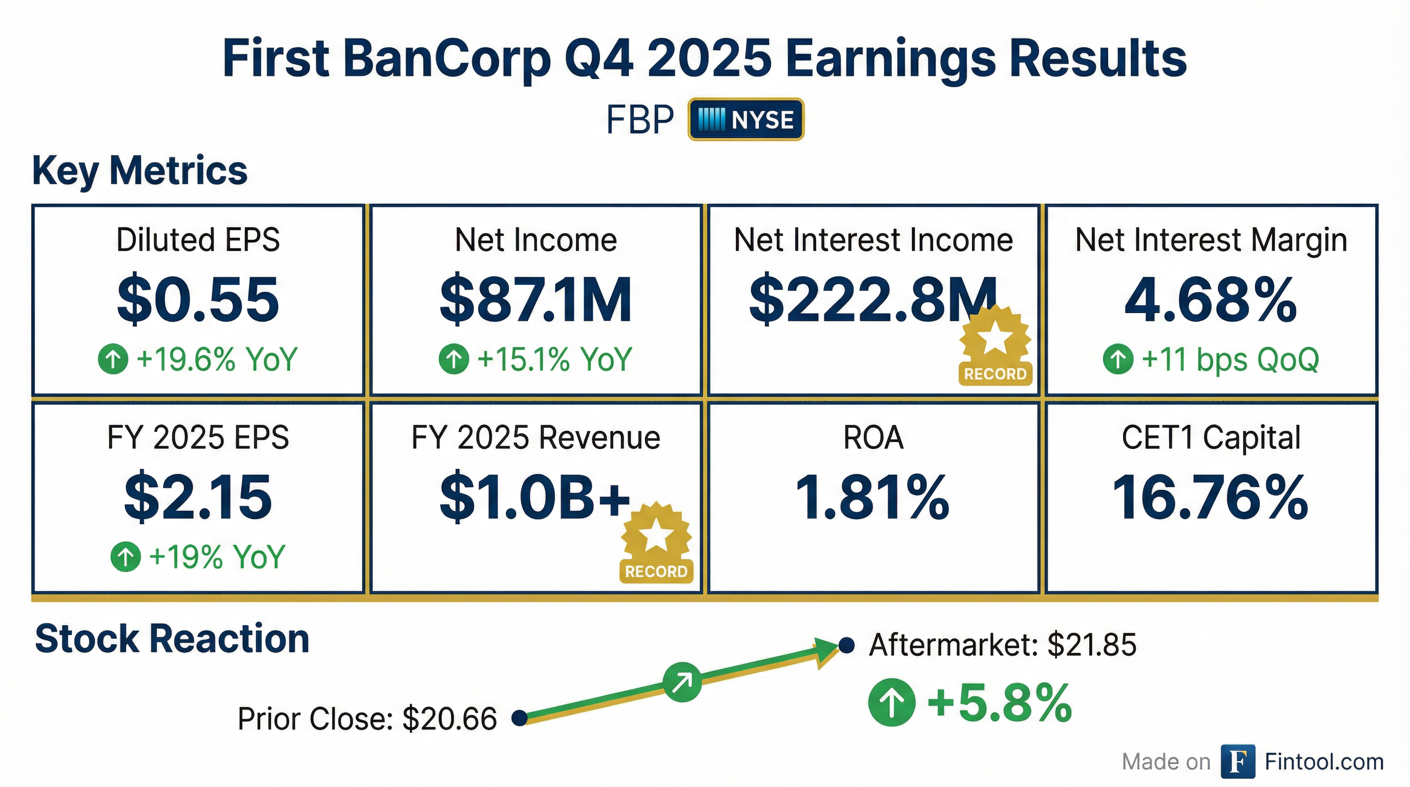 - First BanCorp reported a strong Q4 2025 with $87 million in net income or $0.85 per share, achieving a 1.8% return on assets and a 49% efficiency ratio.