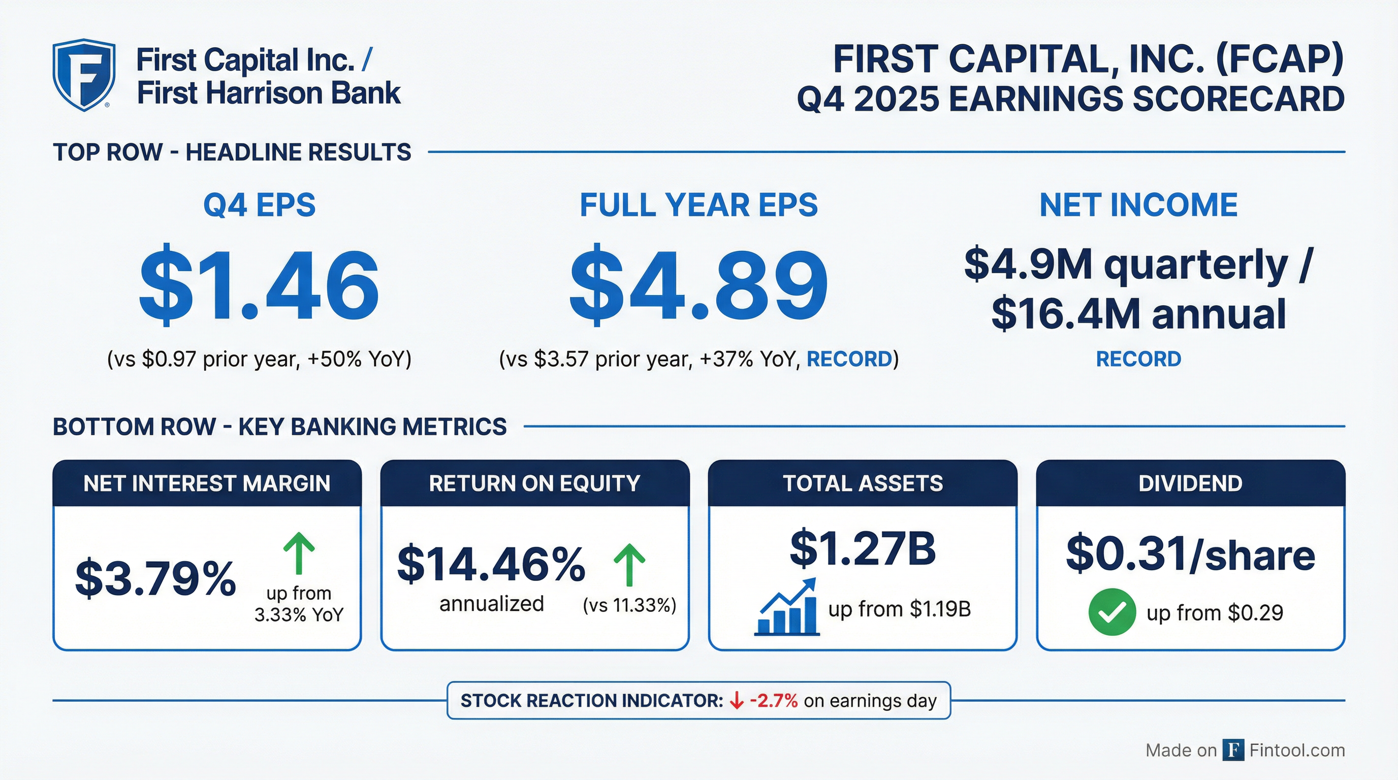 - First Capital, Inc. reported record annual net income of $16.4 million, or $4.89 per diluted share, for the year ended December 31, 2025, an increase from $11.9 million, or $3.57 per diluted share, in 2024.