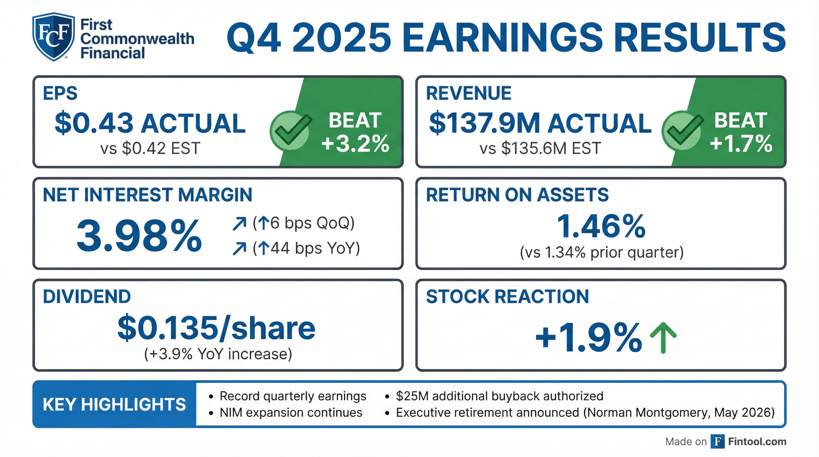 - First Commonwealth Financial Corporation (FCF) reported Q4 2025 core EPS of $0.43 per share, with a net interest margin (NIM) expanding to 3.98%, a core return on assets (ROA) of 1.45%, and a core efficiency ratio of 52.8%.