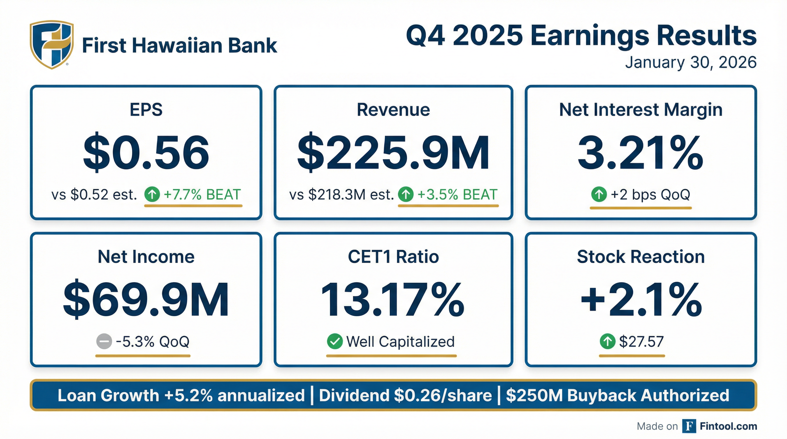 - FHB returned approximately $230 million to shareholders in 2025, including a Q4 2025 dividend of $0.26 per share and $26 million in share repurchases. The company has a current repurchase authorization of up to $250 million.