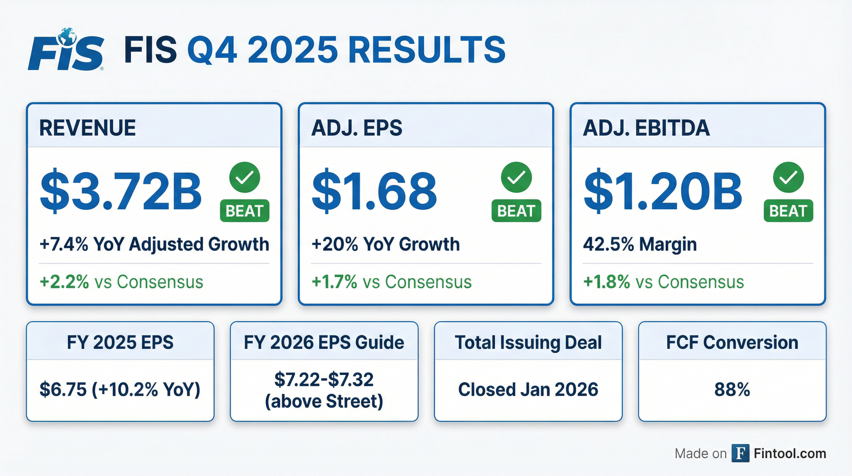 - FIS delivered FY 2025 5.8% adjusted revenue growth and >10% adjusted EPS growth to $5.75, generating robust free cash flow and returning $1.3 billion to shareholders through buybacks.