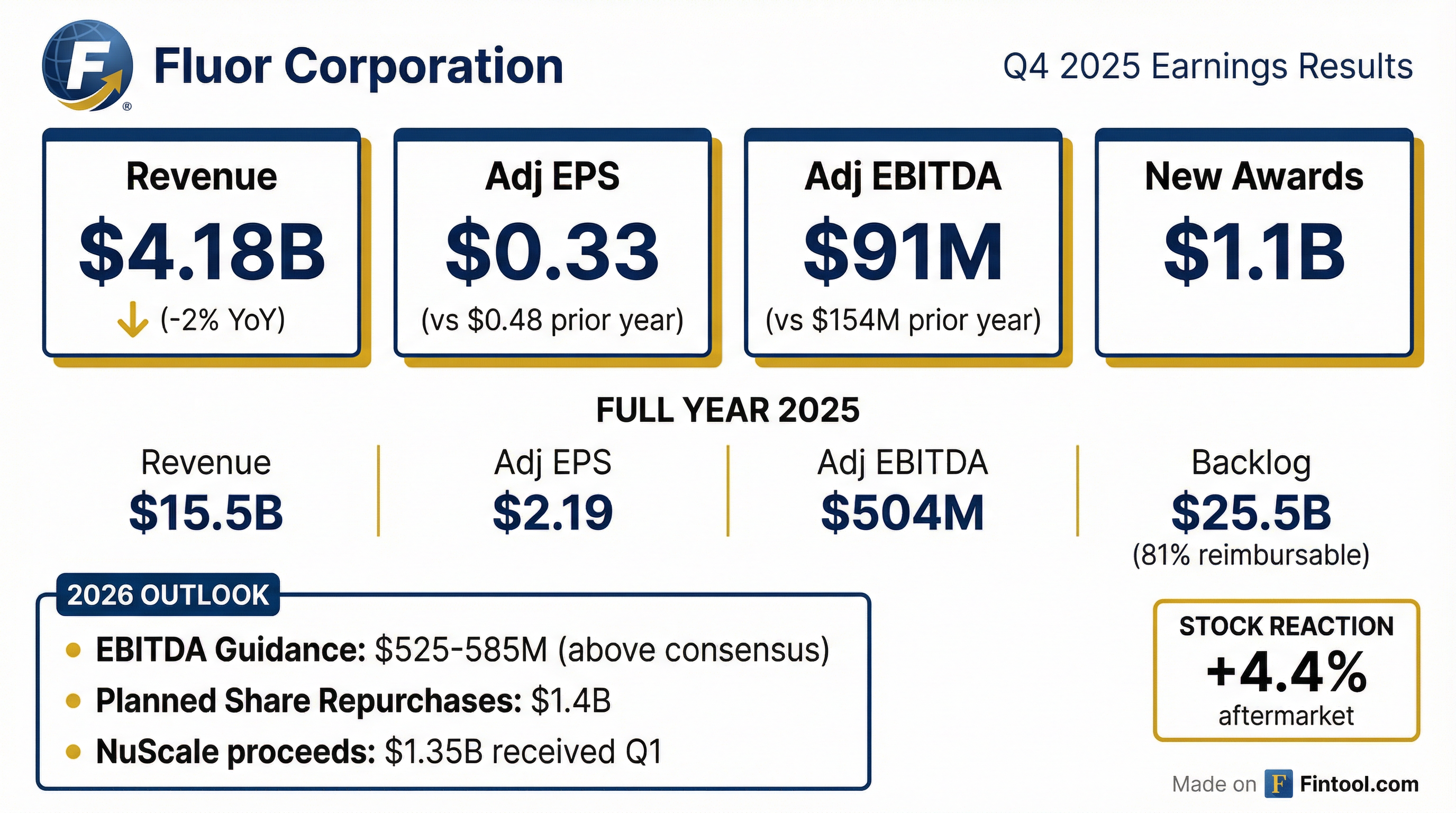 - Fluor Corporation reported full year 2025 revenue of $15.5 billion, a GAAP net loss attributable to Fluor of $51 million, adjusted EBITDA of $504 million, and adjusted EPS of $2.19.